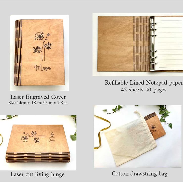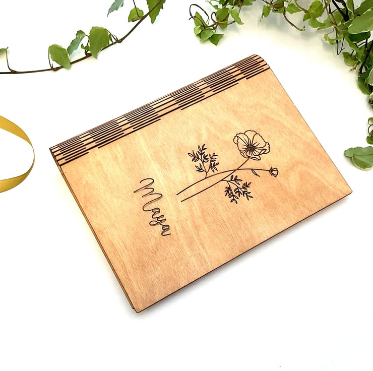 Celebrate nature and individuality with this custom engraved wooden notebook, featuring your birth flower and name. Handmade from FSC-certified birch plywood, each piece is dyed, varnished, and truly one of a kind — a thoughtful gift for birthdays, writers, and eco-conscious friends.