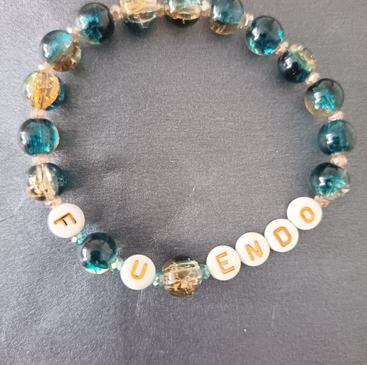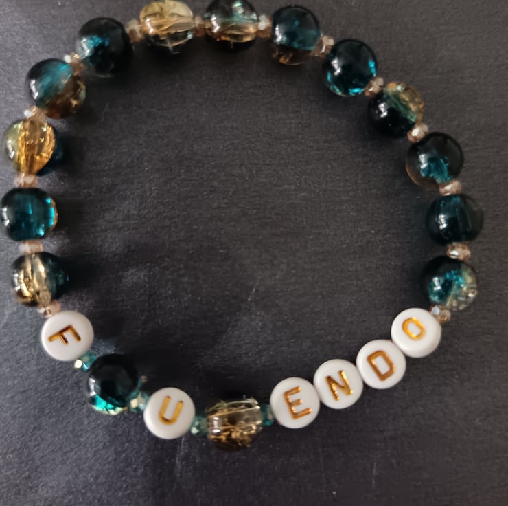 This handmade bracelet is crafted with magic stretch elastic, white and gold word beads spelling " F U ENDO" and glass beads of various sizes, in pale gold, light blue and darker blue with yellow streaks.