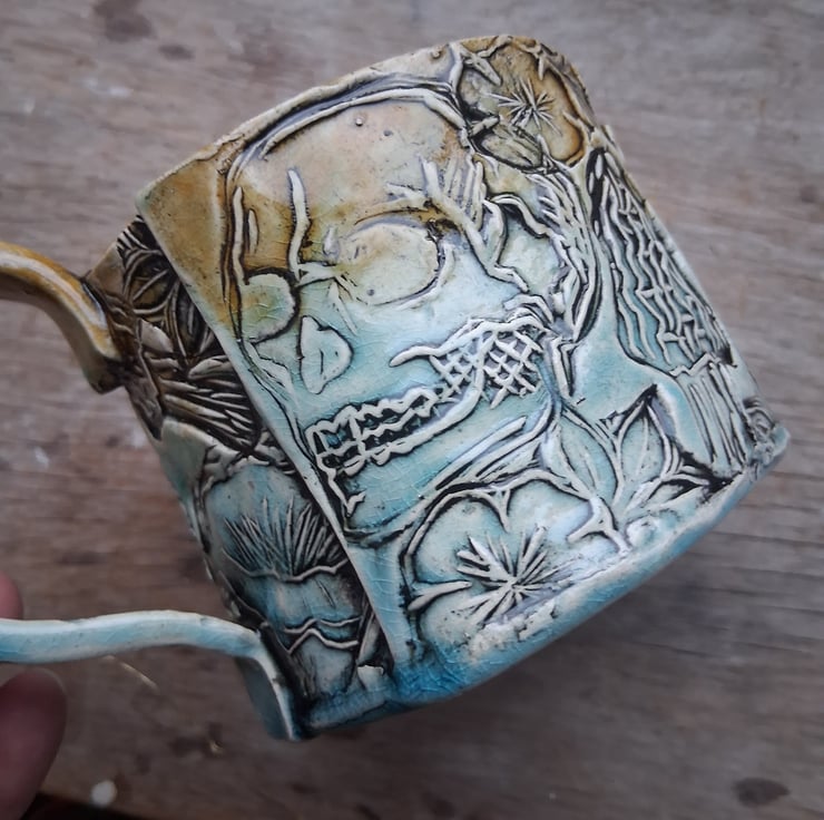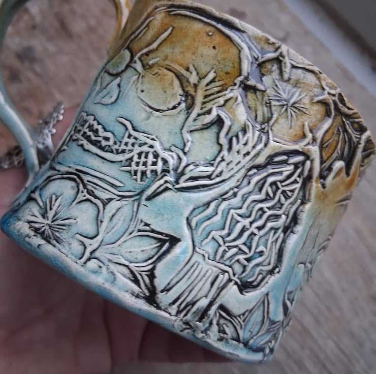 in turquoise and wheat glaze, this pretty mug is decoratesd with skulls, mushrooms and flower blossoms
