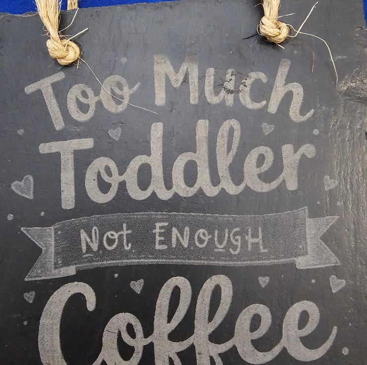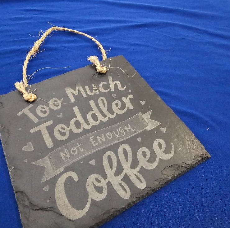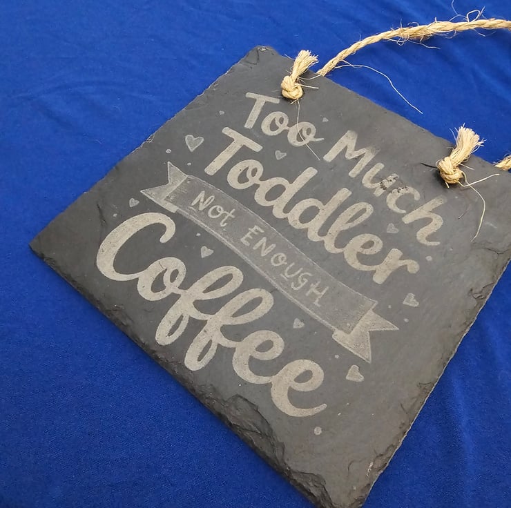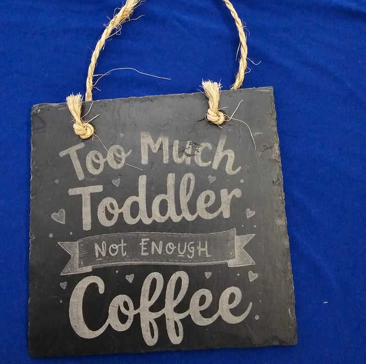 Slate sign 14.5 x14.5 cm -hand cut slate with 'too much toddler not enough coffee design laser engraved. Comes with natural hanging string attached. Finished with weatherproof lacquer for protection.