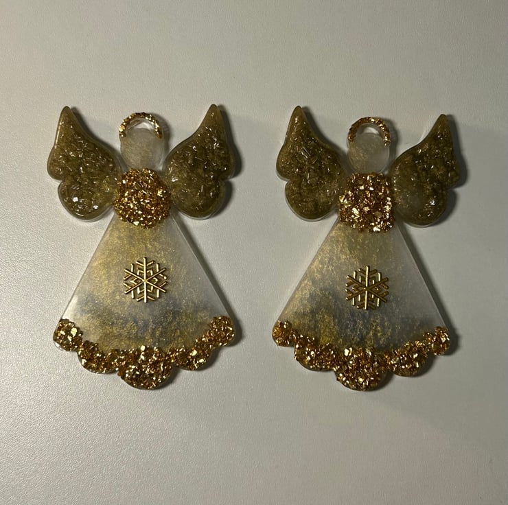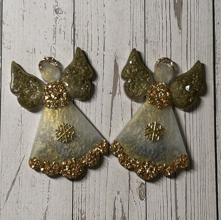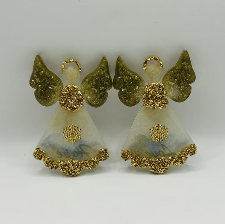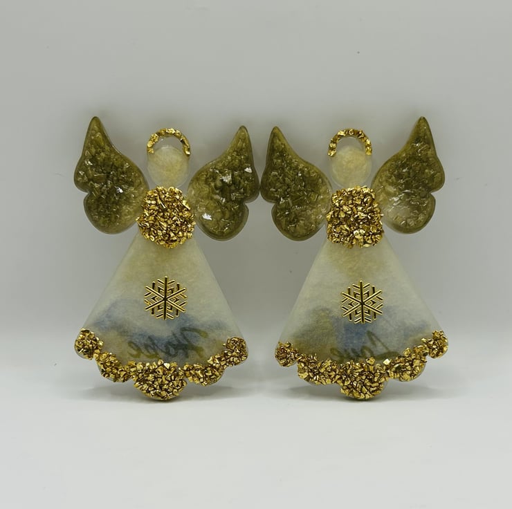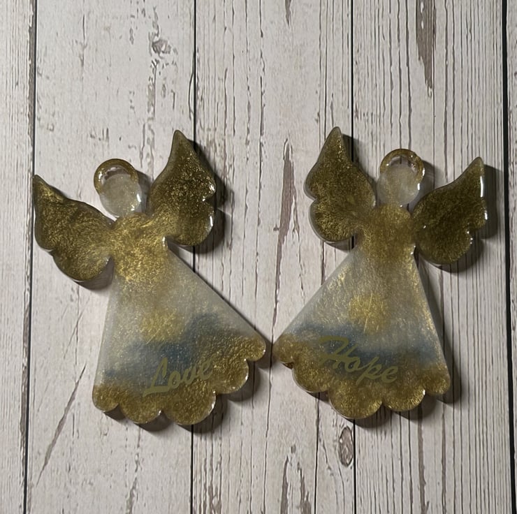 Celebrate the season with these handcrafted resin angel decorations in beautiful hues of gold and bronze. Each angel features shimmering gold crushed glass, bronzy drusy wings and a delicate gold snowflake charm. On the back, you'll find a meaningful word, either Love, or Hope in elegant gold vinyl.
