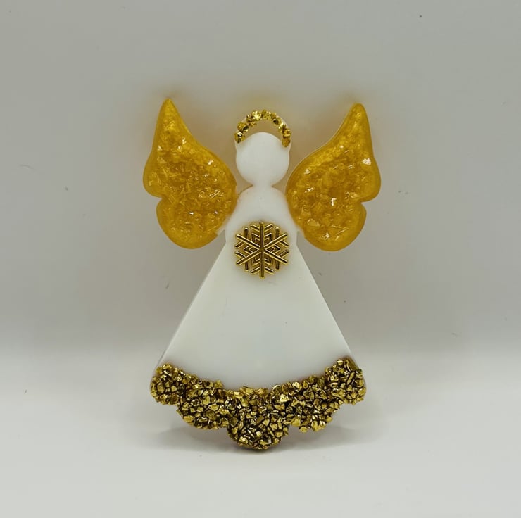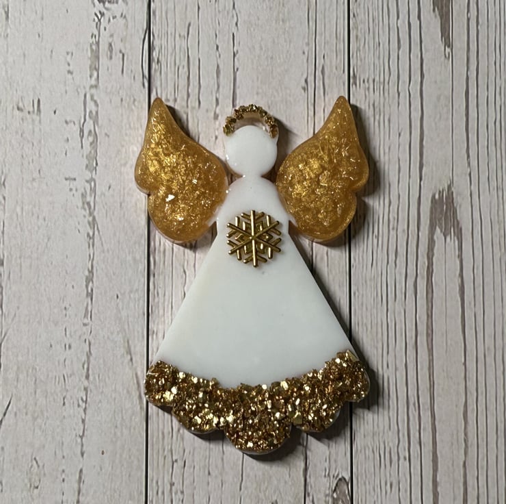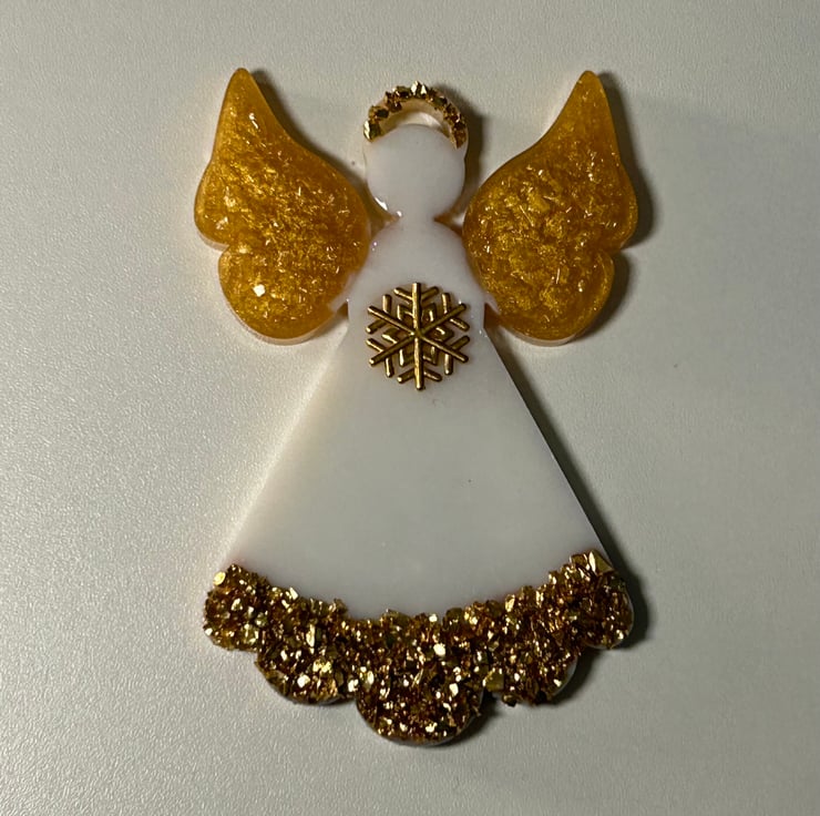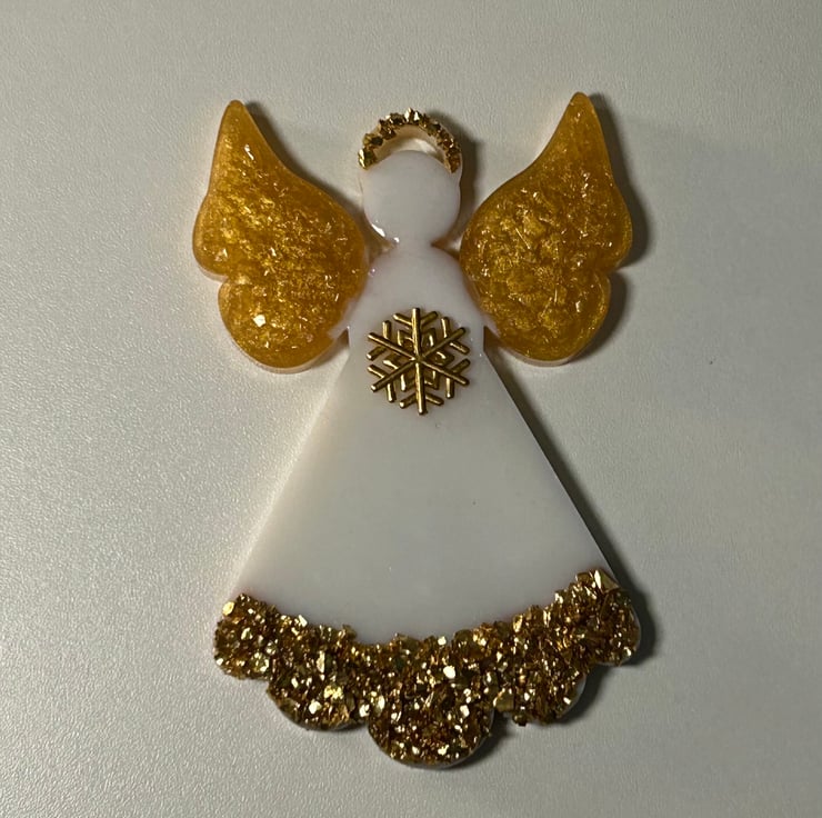 Celebrate the season with these handcrafted resin angel decorations in crisp and elegant colours of gold and white. Each angel features shimmering gold crushed glass, gold drusy wings and a delicate gold snowflake charm. On the back, you'll find a meaningful words Peace, Love, Hope or Joy in elegant gold vinyl.