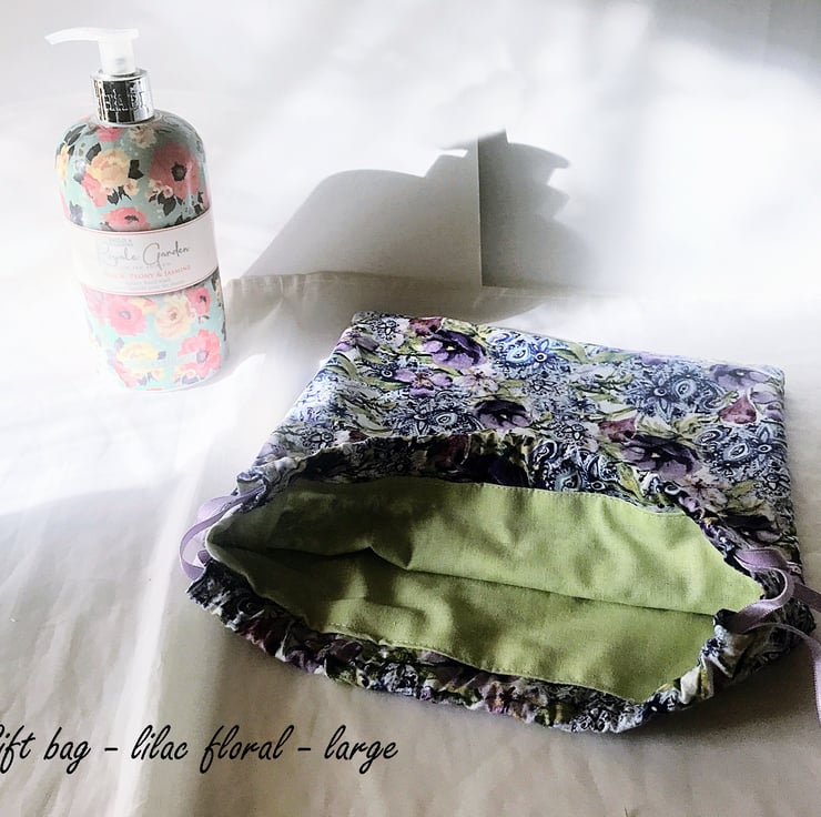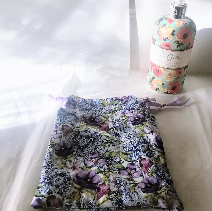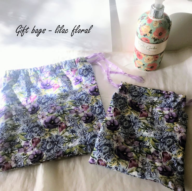 Drawstring gift bags, made from lilac floral print cotton fabric.