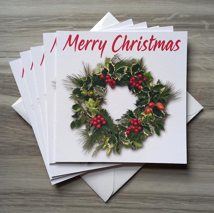 This festive set of five identical Christmas cards features a beautiful photo of a handmade Christmas wreath — created by my wife last year and captured to share its warmth and charm.