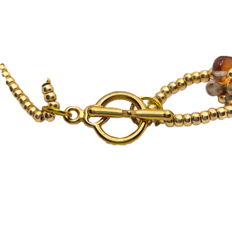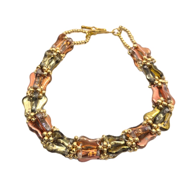A Czech glass link bead bracelet in autumn gold colours with seed beads connecting the beads