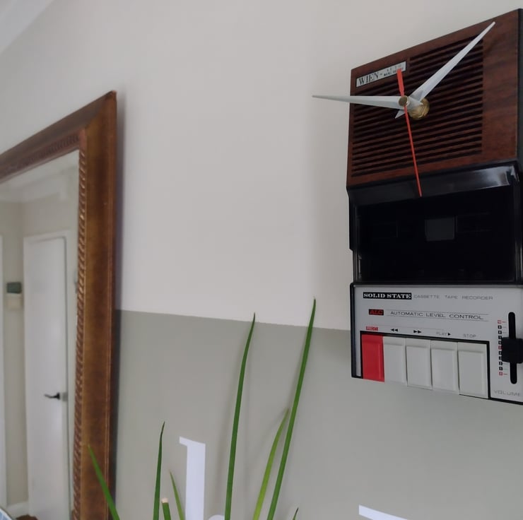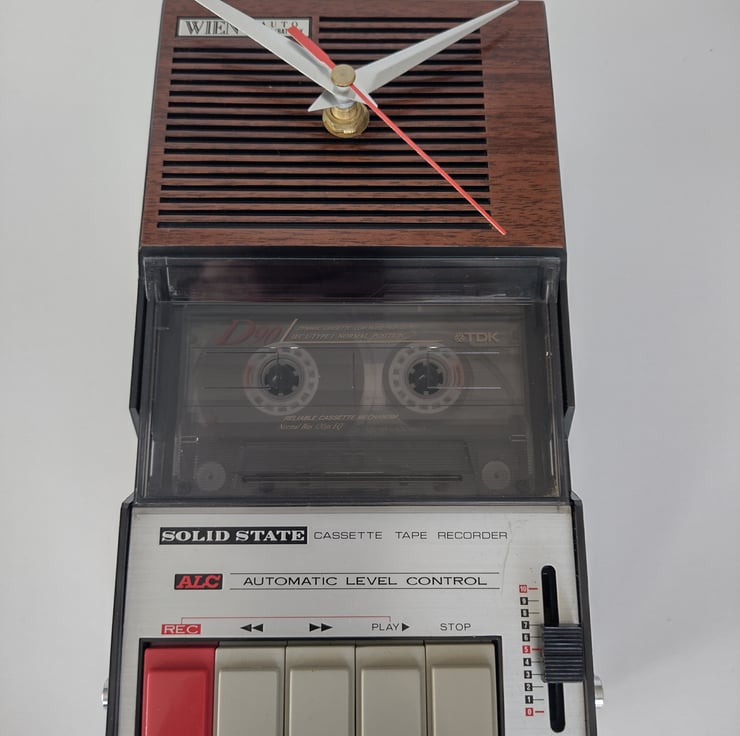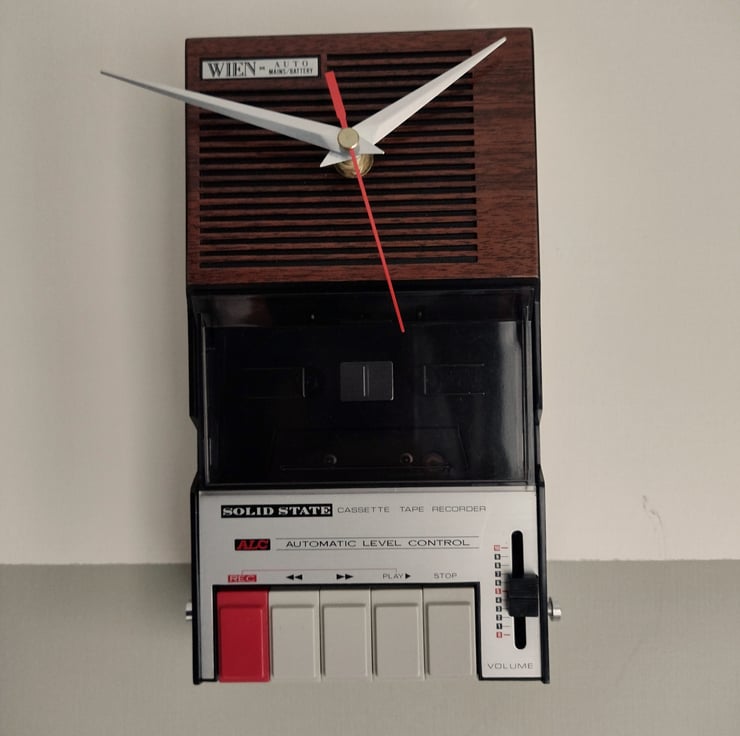 This one-of-a-kind wall clock began life as a classic 1970s cassette recorder, now lovingly upcycled into a unique functional clock.