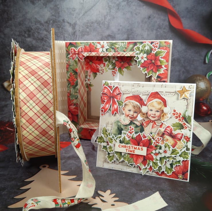 Inside, a beautifully layered shadow box scene creates depth and warmth — with space for a small greeting card or a thoughtful Christmas gift, such as a gift card or keepsake.