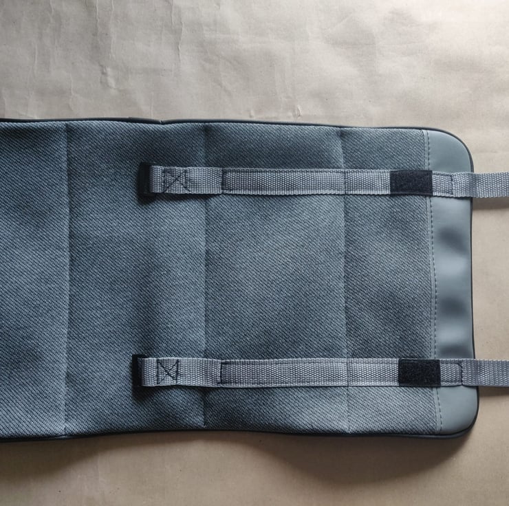 Outer fabric is a black and grey woven polycotton (car seating fabric) with a grey vinyl/faux leather panel detail on each end. The inner is a grey waterproof canvas.