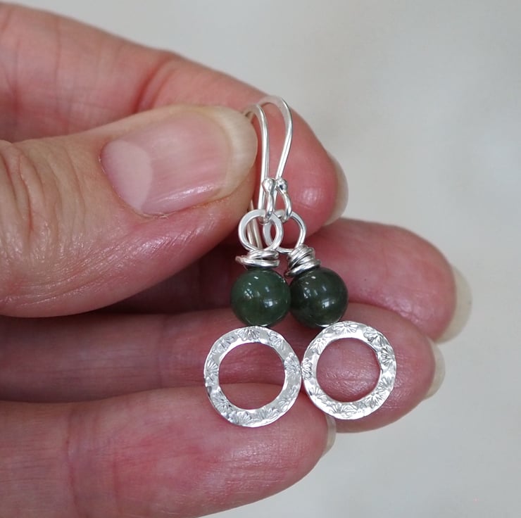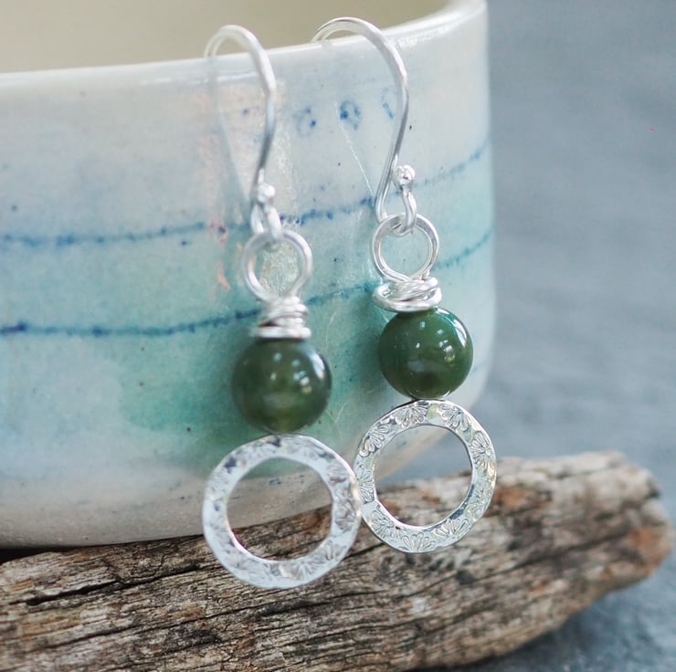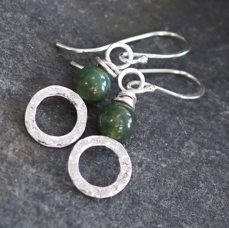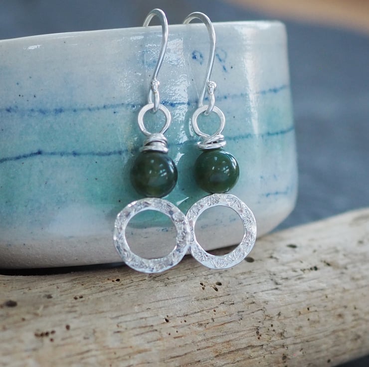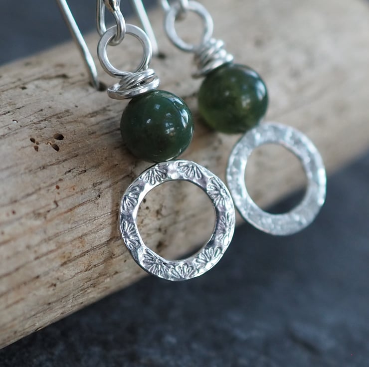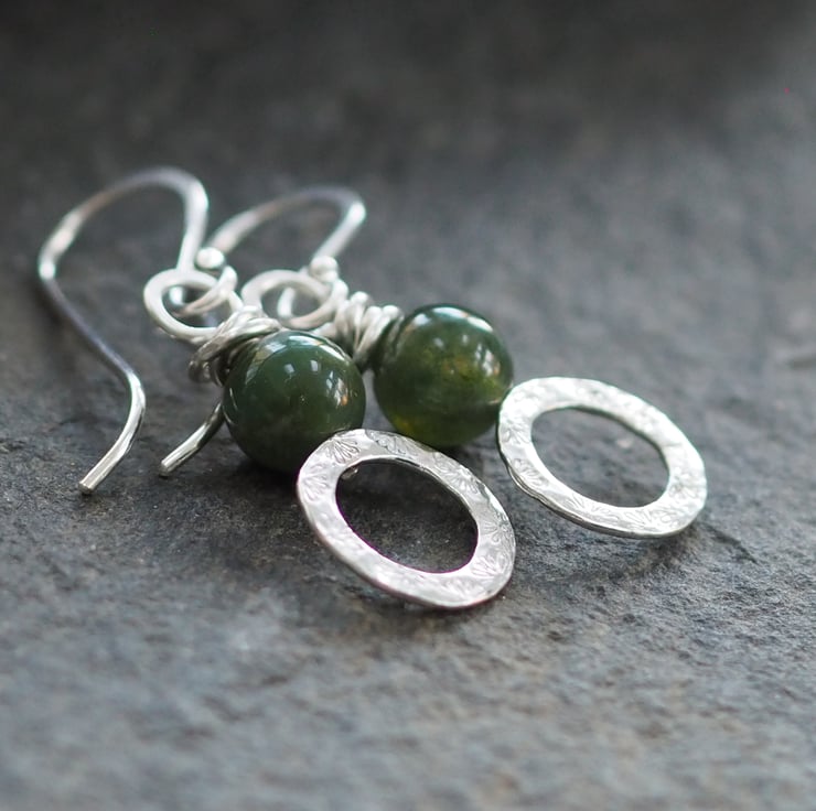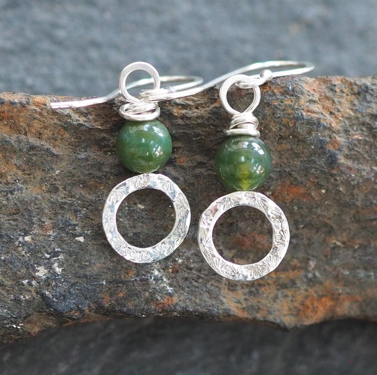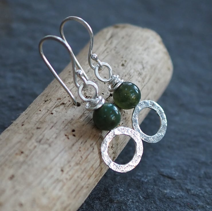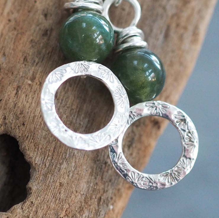 Green moss agate silver hoop daisy chain earrings, silver hoop earrings