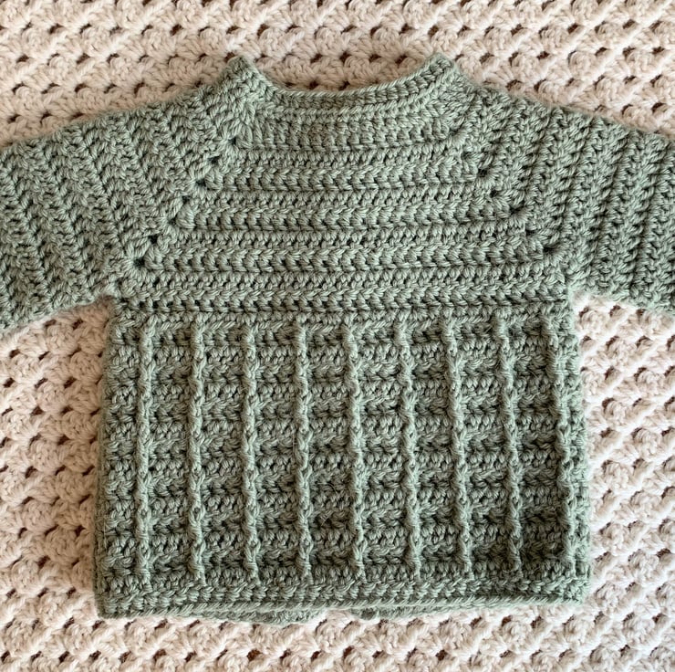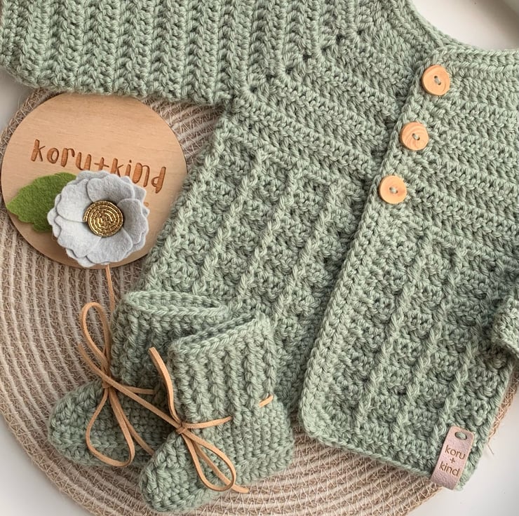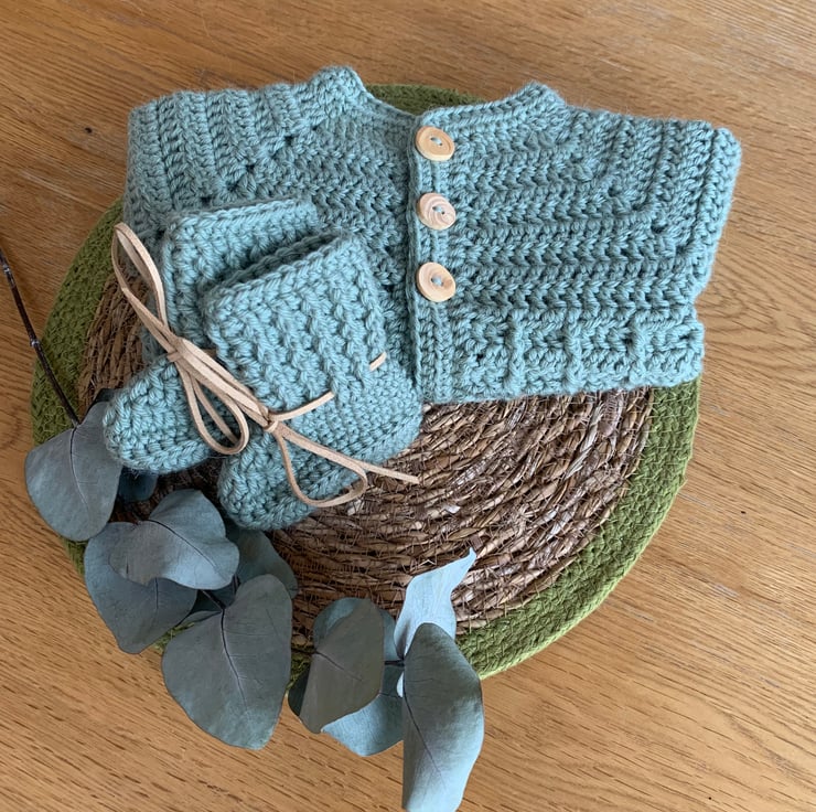 The sage green cardigan in the listing picture is 0-3 months size and made with a 65% wool and 35% alpaca blend yarn.