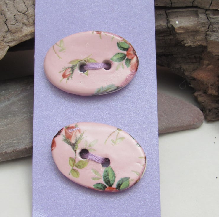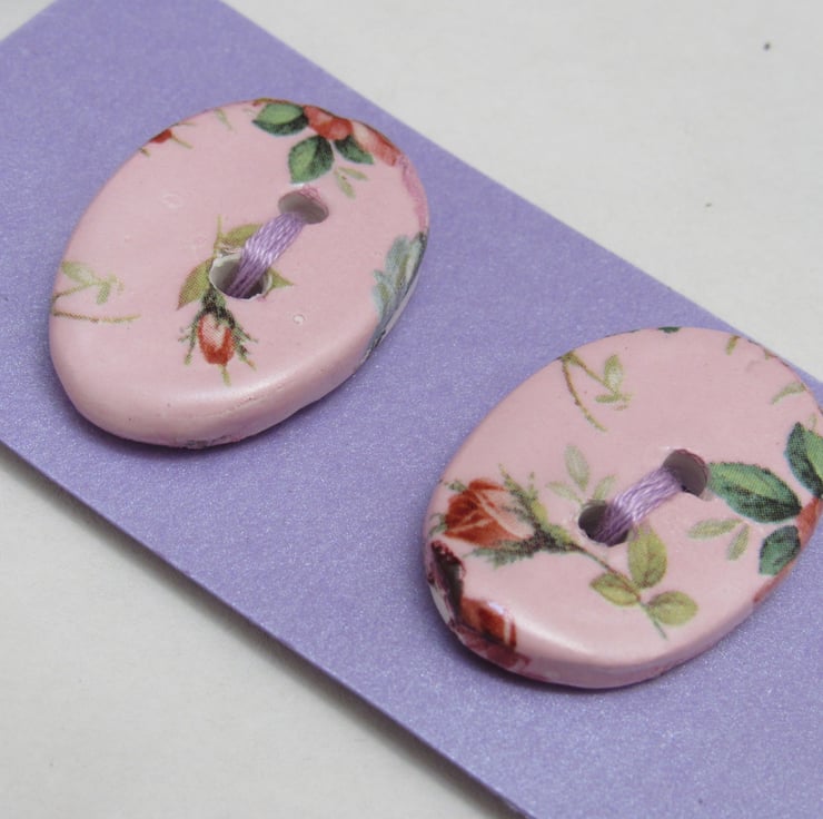 2 glazed white earthenware buttons finished with a pastel pink floral chintz pattern