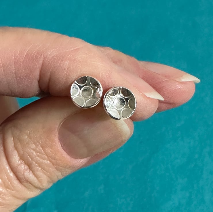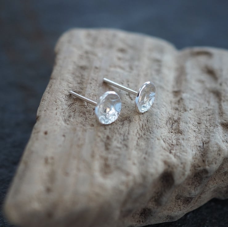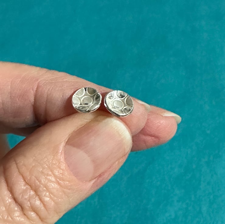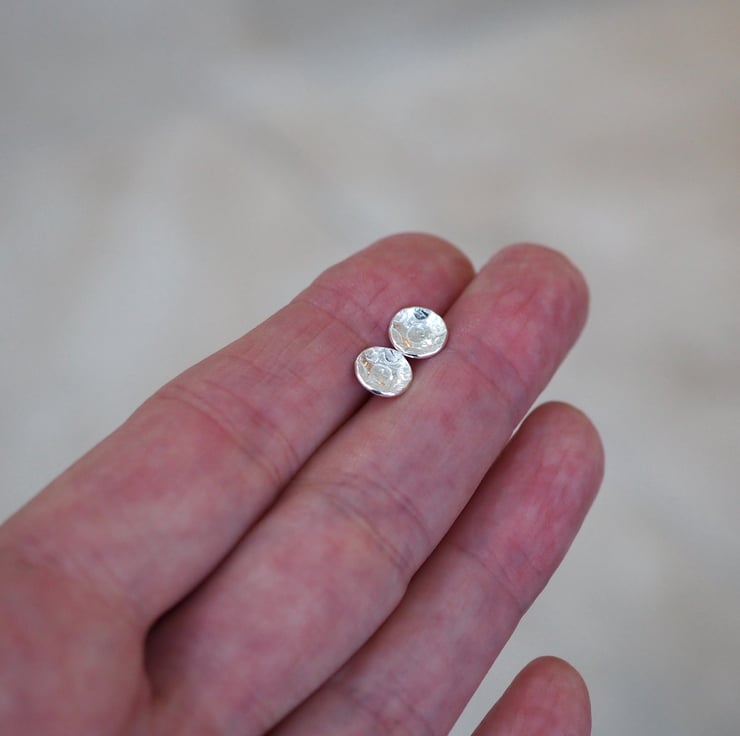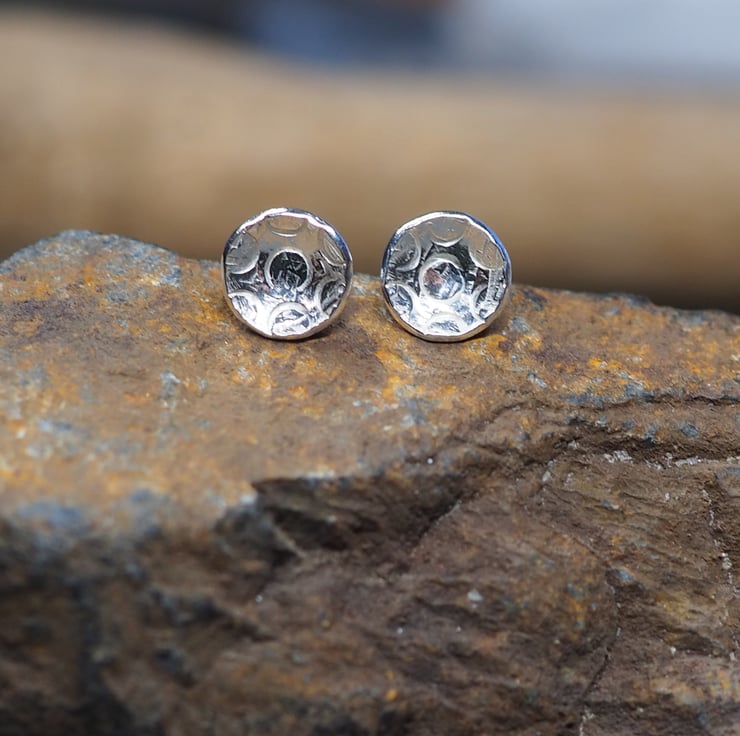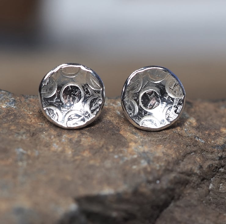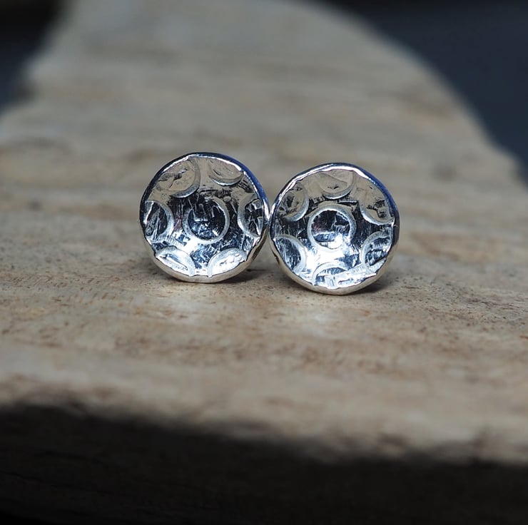 Small round silver stud earrings with texture punched into the silver. These stylish silver earrings are great for everyday wear and would make a lovely gift.
