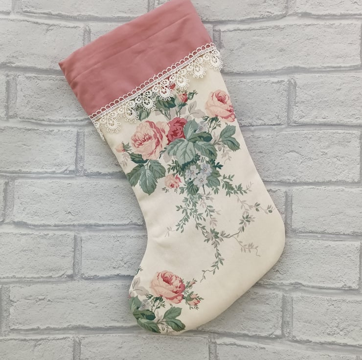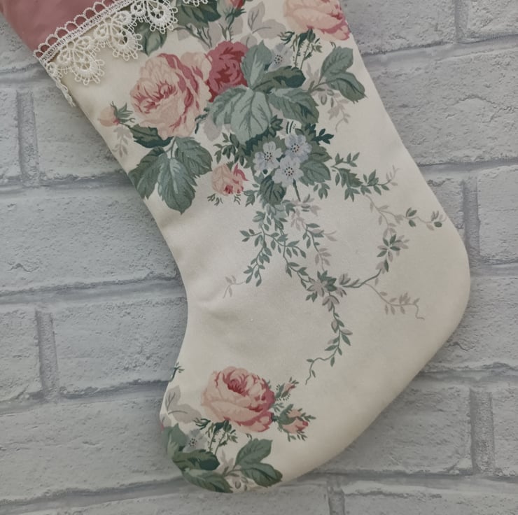 This stocking is made with beautiful vintage rose print cotton fabric, trimmed with a lovely delicate lace trim, lined and padded with plain fabric. Hanging loop attached. No two stockings in my shop are exactly alike — each one is uniquely handmade to bring joy to your mantel and fill with precious gifts for loved ones.