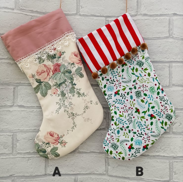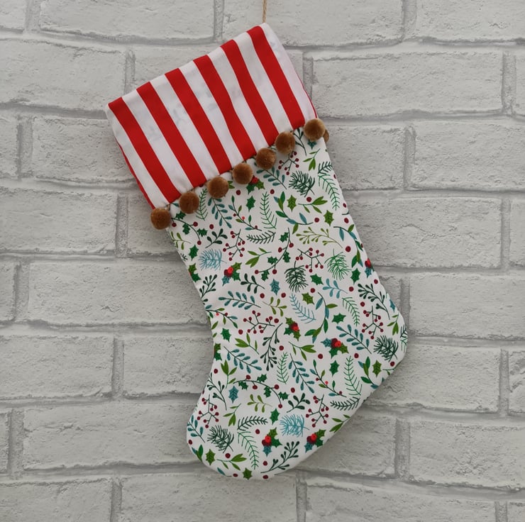 This stocking is made with a lovely Christmas print cotton fabric, lined and padded with plain fabric. Hanging loop attached. No two stockings in my shop are exactly alike — each one is uniquely handmade to bring joy to your mantel and fill with precious gifts for loved ones.