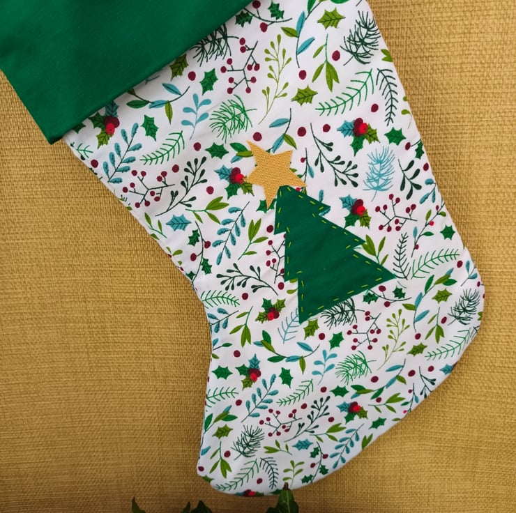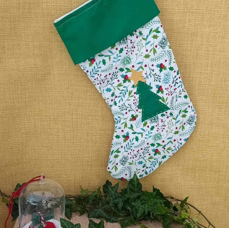 This stocking is made with a lovely Christmas print cotton fabric, lined and with plain fabric. Hanging loop attached. No two stockings in my shop are exactly alike — each one is uniquely handmade to bring joy to your mantel and fill with precious gifts for loved ones.
