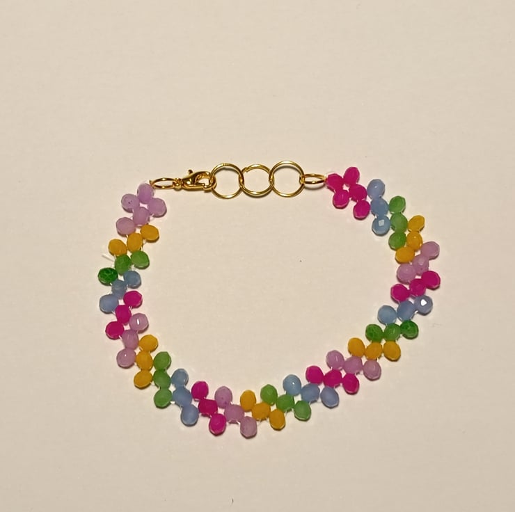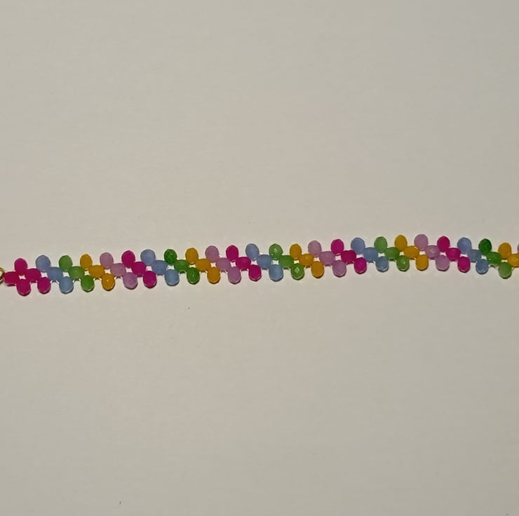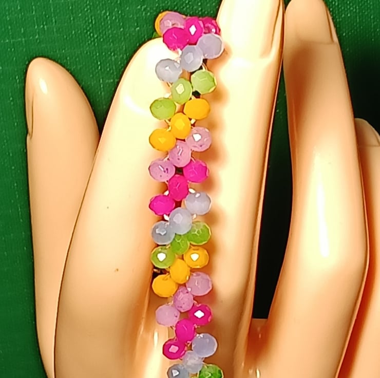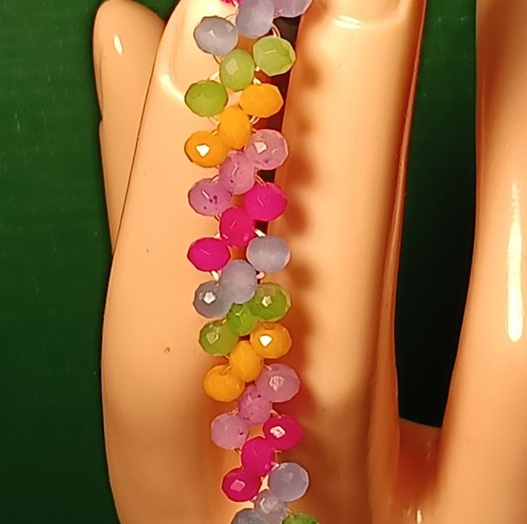 This unique piece is made of 4mm magenta crystal beads, 4mm translucent blue crystal beads, 4mm green crystal beads, 4mm yellow crystal beads and 4mm lavender crystal beads.