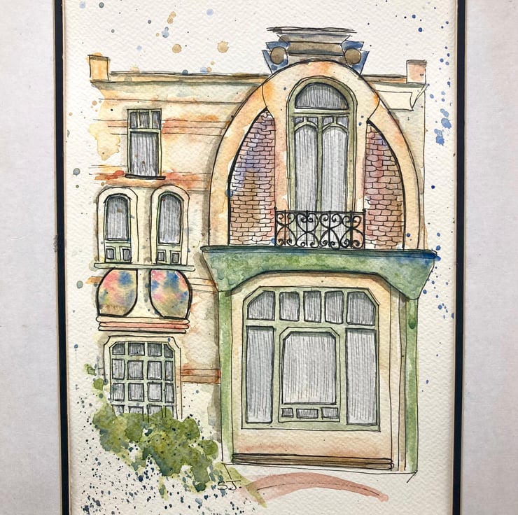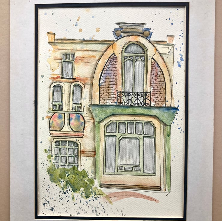 The his stylish fine art piece is a fun urban sketching of a beautiful Art Deco house in the beautiful city of Brussels in Belgium. It is one of my very favourite pieces that I have painted. I just thought all the elements of the art just went together so well. I love the pen sketch and all the watercolours just blended together beautifully. I also love splattering so it was all fun.