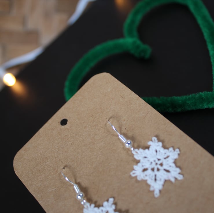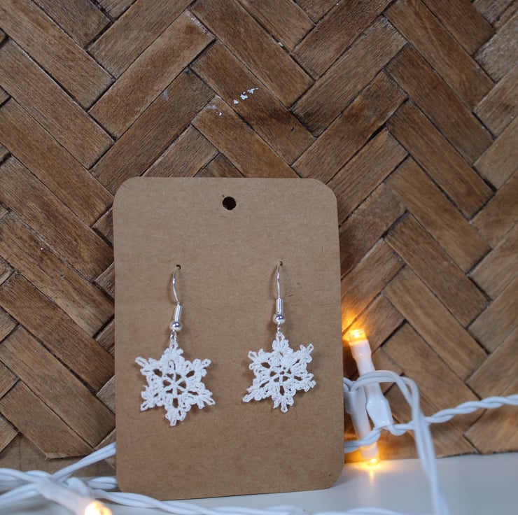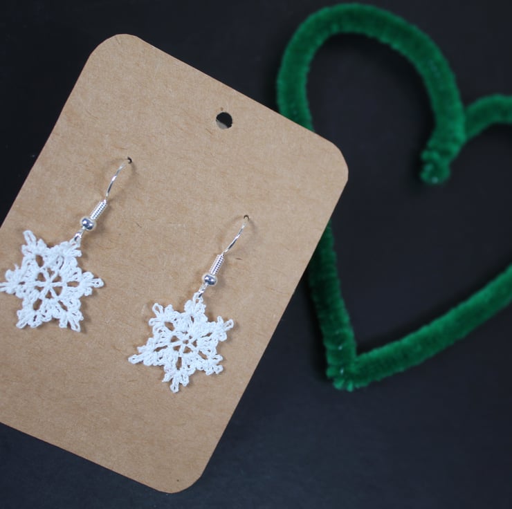 These are hand crocheted mini snowflake earrings. Each is individually made using soft white craft yarn and approximately 2cm (0.8 inches).The earring hooks are 925 sterling silver earring hooks - hypoallergenic ear wire. They come with small rubber backs to secure them and a small display card that is 5.6cm (2.2 inches) wide and 7.8cm (3.1 inches) in length.