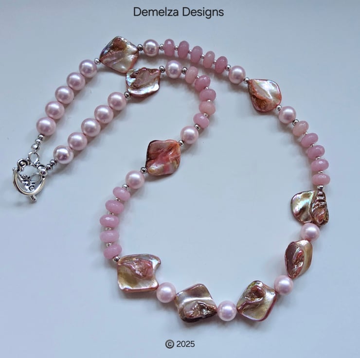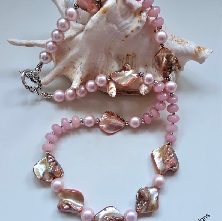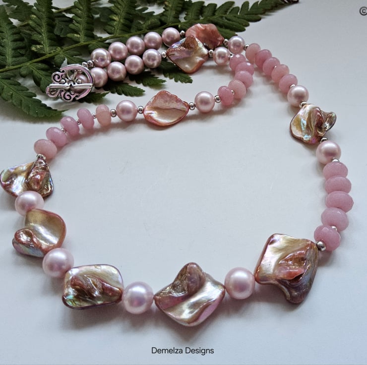 This eye catching necklace has been lovingly designed and hand crafted in Cornwall using faceted pink jade rondelles, shell pearls and square shaped mother of pearl.