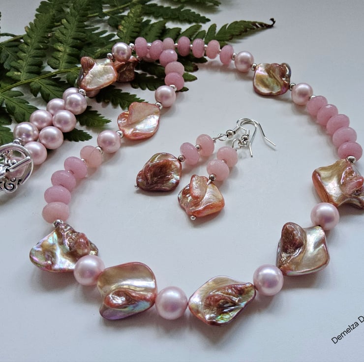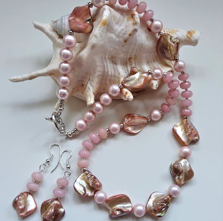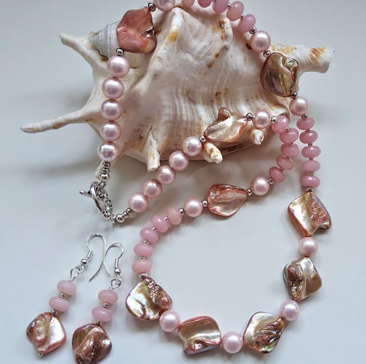 Designer Shell Pearl, Pink Jade & Shell Necklace & Earrings Set
