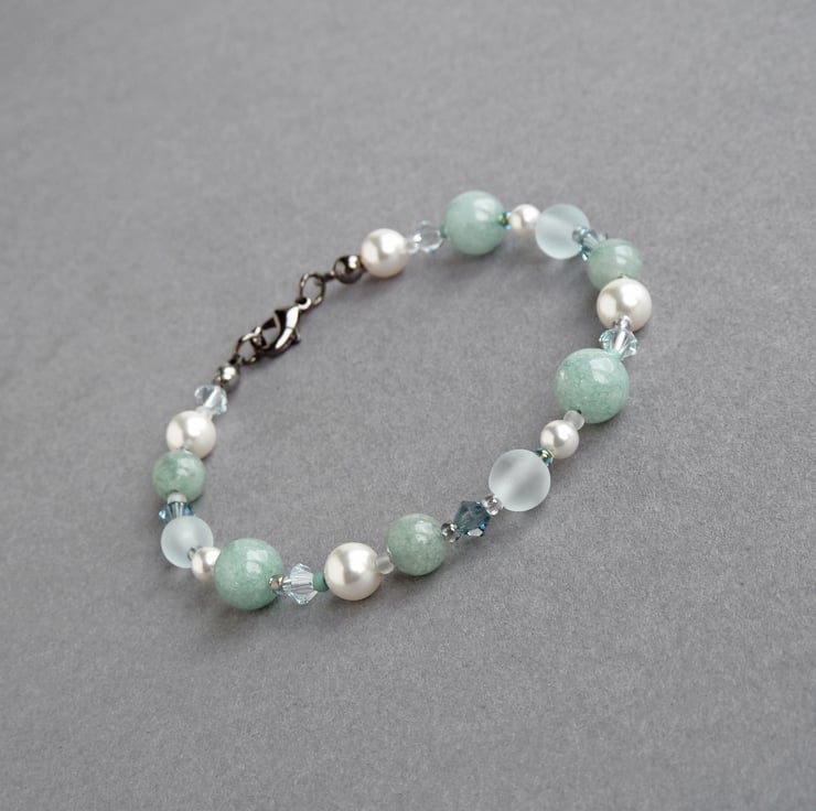 This sage green jewellery set incorporates glass pearls, sea glass, jade, sparkling crystals and frosted glass beads. As these "bits and bobs" necklaces come in a range of different colours, they make great gifts for women who enjoy colourful jewellery.