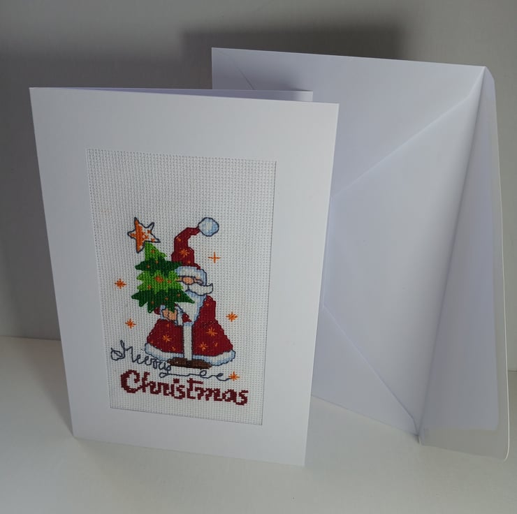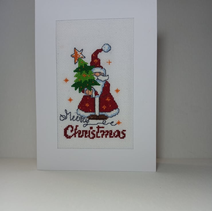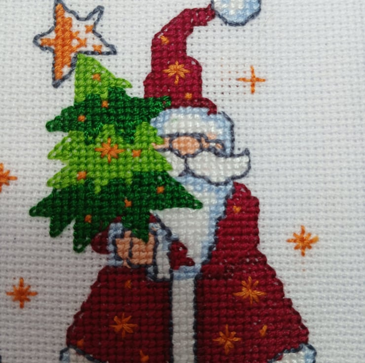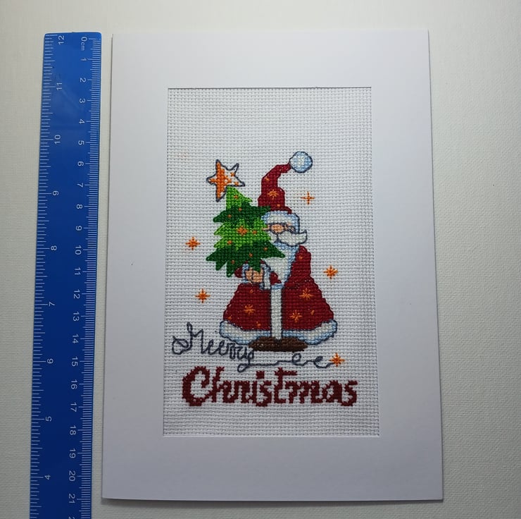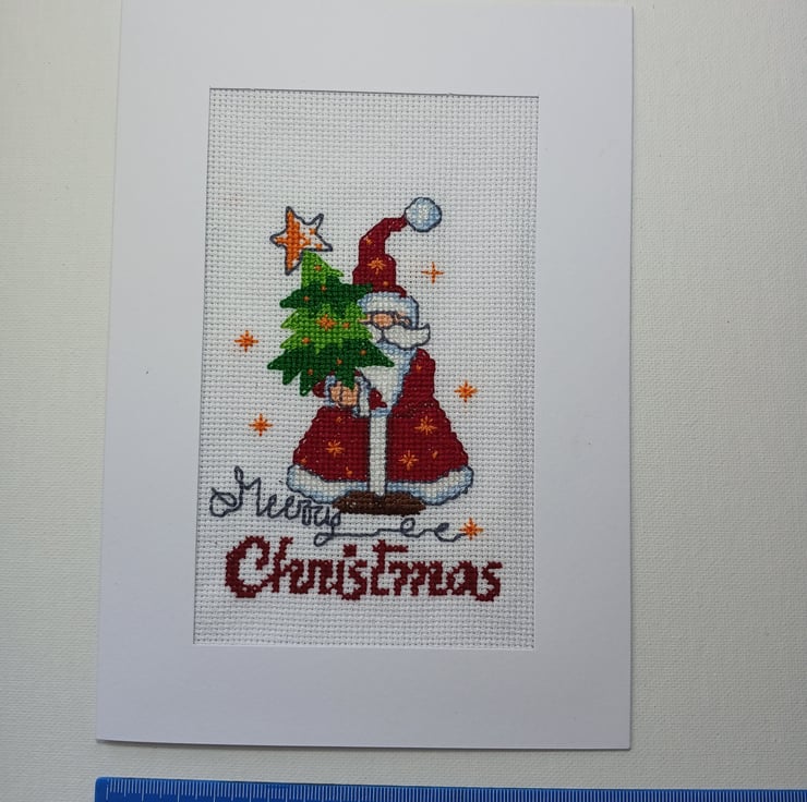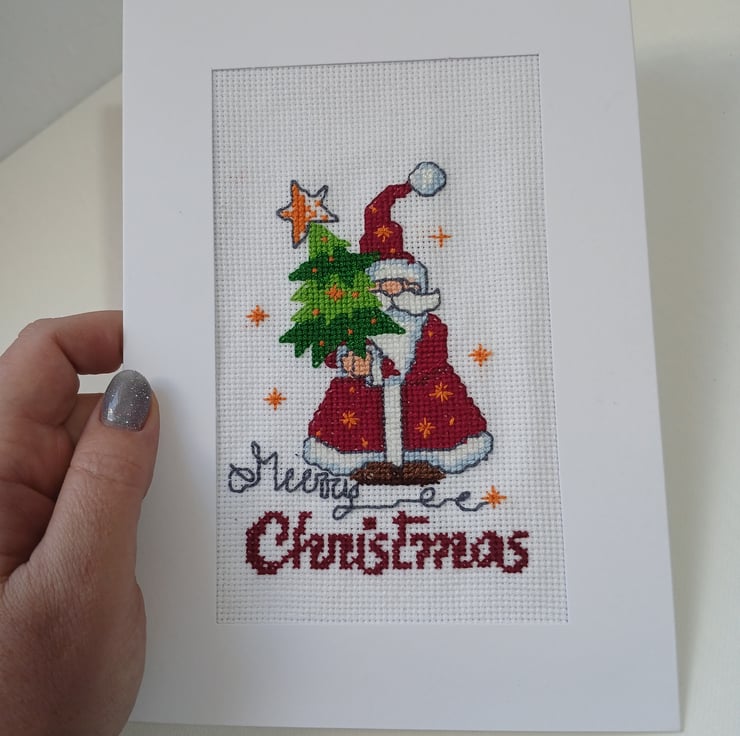 Festive Cross-Stitch Christmas Card – Santa with Tree – Handmade Holiday Charm