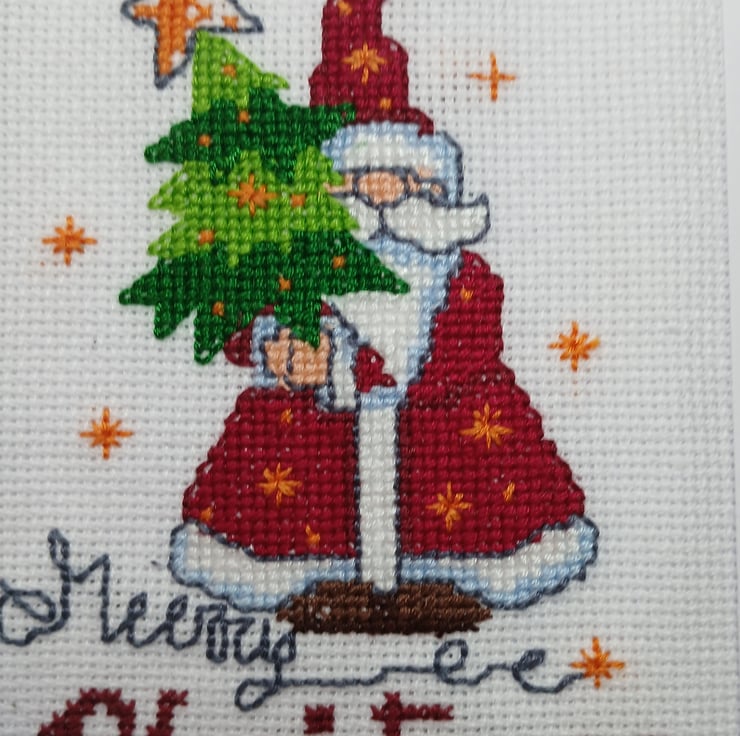 Bring warmth and tradition to your festive season with this lovingly handmade Christmas card featuring a detailed cross-stitch design. A charming Santa Claus in his classic red robe holds a decorated Christmas tree, surrounded by tiny orange stars and the cheerful message “Merry Christmas” stitched in vibrant thread. Each stitch is placed with care, creating a heartfelt keepsake that’s perfect for gifting or displaying. Whether you’re sending holiday wishes or collecting unique seasonal art, this card adds a personal touch to Christmas.