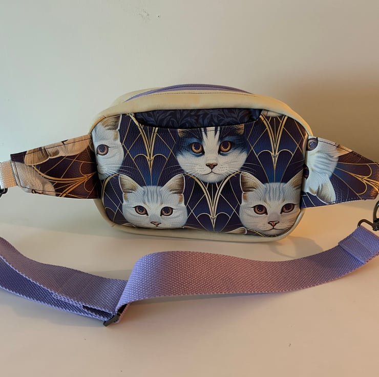 The bag is made from contrasting vinyl, the main panels being in a cute cat patterned vinyl. The waist strap is adjustable.