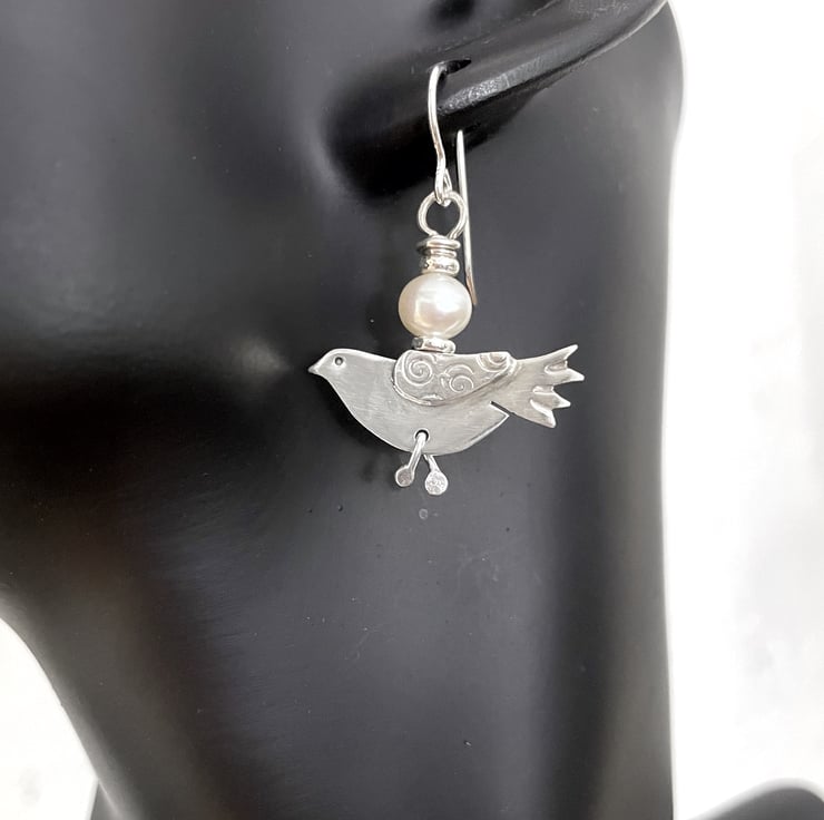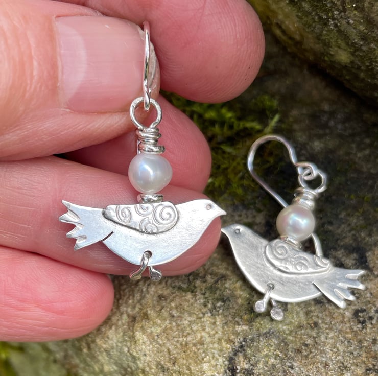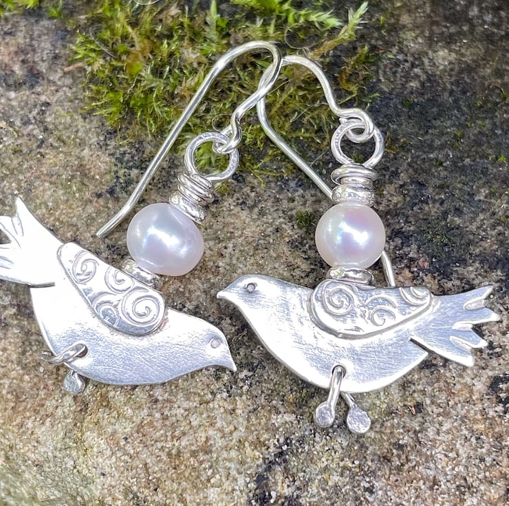 These little silver doves have a swirly wing and free moving legs, they are topped with white pearls and hung from handmade hooks.