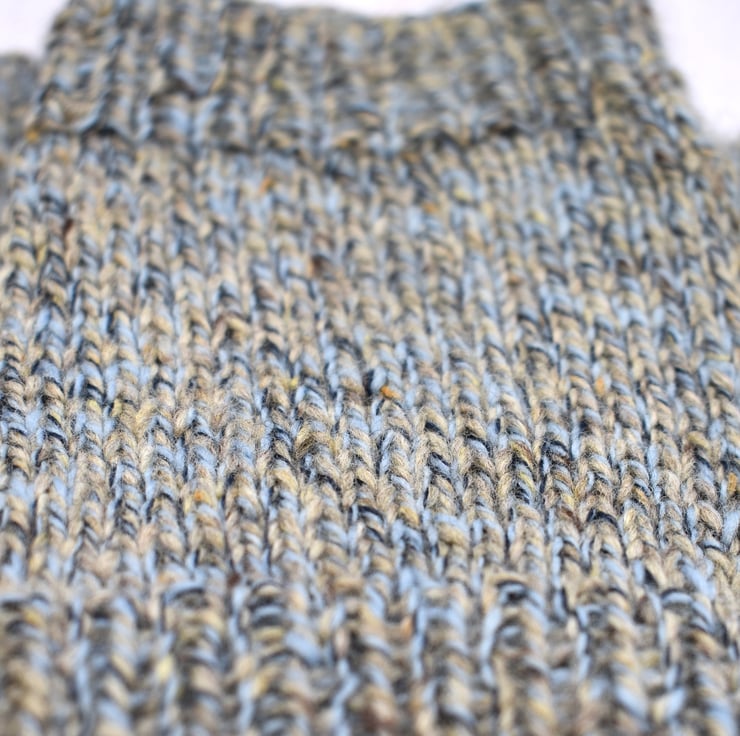 I have used Scottish marled lambswool which will bloom and soften up even more when hand washed. The yarn has blue, grey and black strands with a beige fleck which knits up to a marled finish.