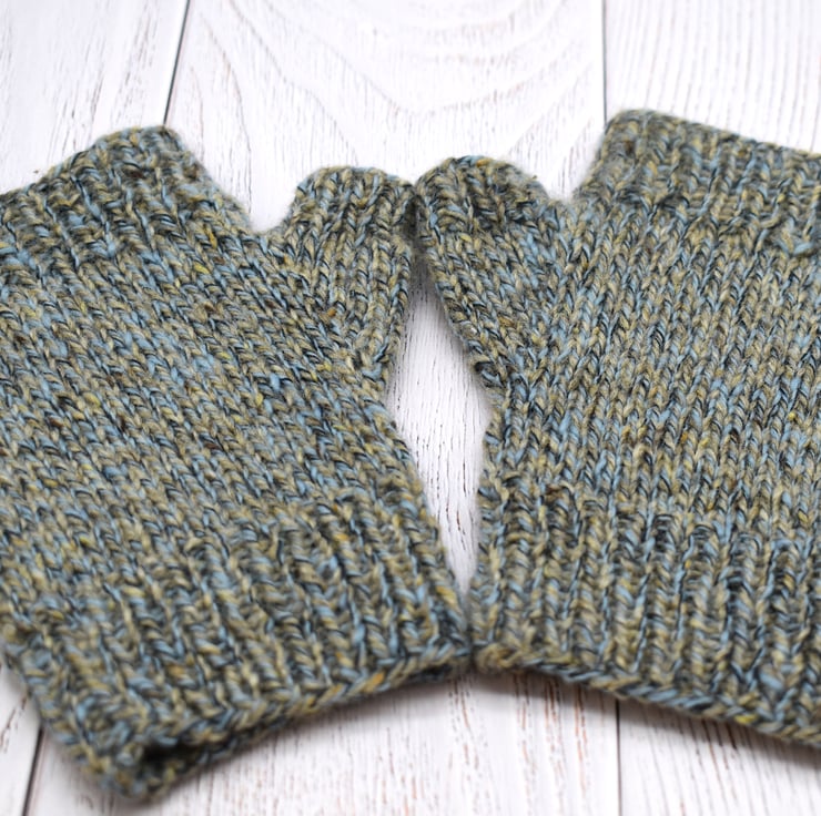 These hand knitted fingerless mittens are great for keeping your hands and wrists warm on those cold winter days.