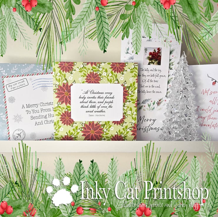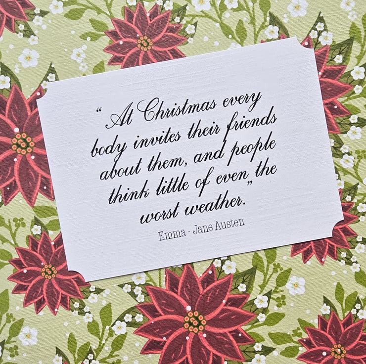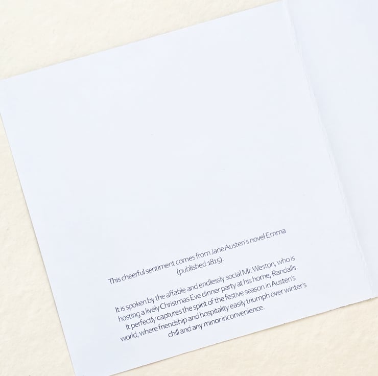 Celebrate the festive season with this elegant pack of five Christmas cards featuring a delightful quote from Jane Austen’s classic novel, Emma. Perfect for sending to fellow book lovers, book club friends, Austen enthusiasts, and anyone who cherishes the joy of holiday gatherings.