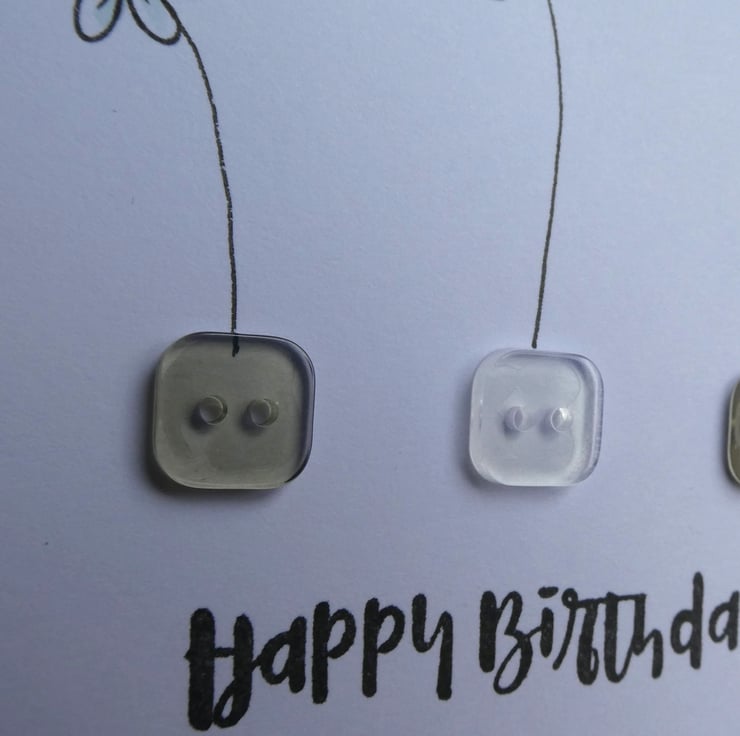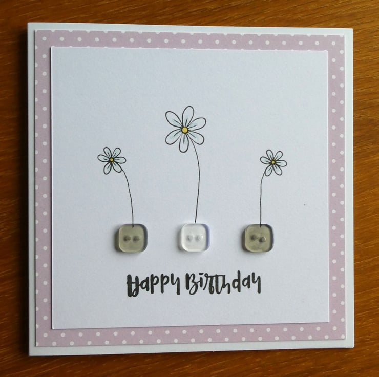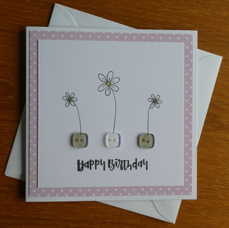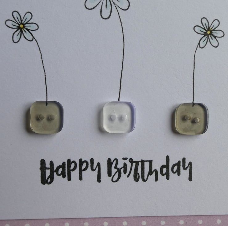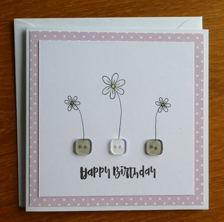 This pretty birthday card has a row of 3 daisies in button 'vases' and the message Happy Birthday.