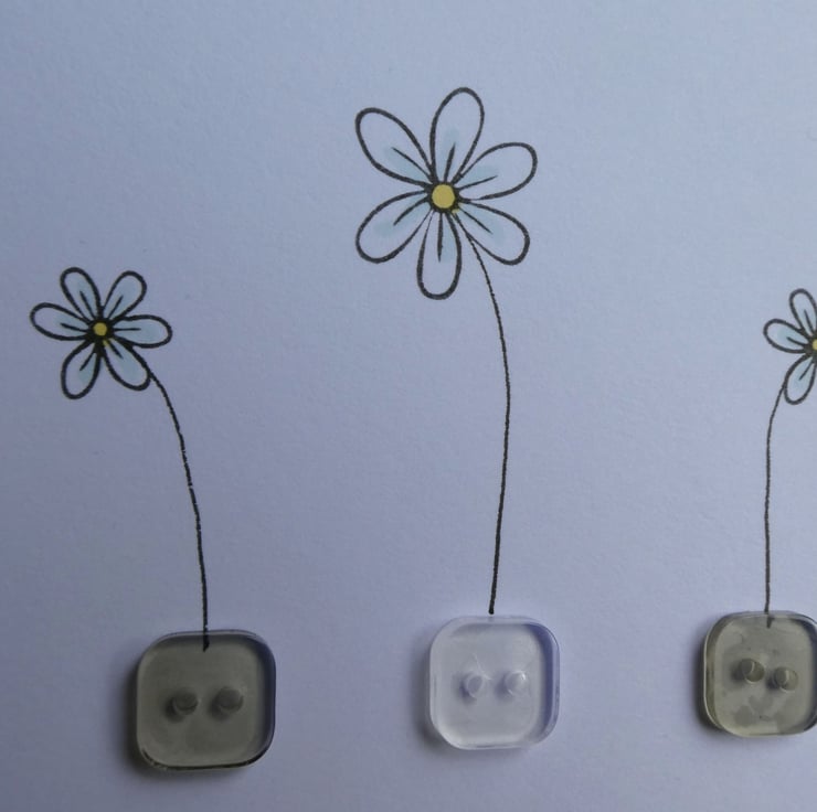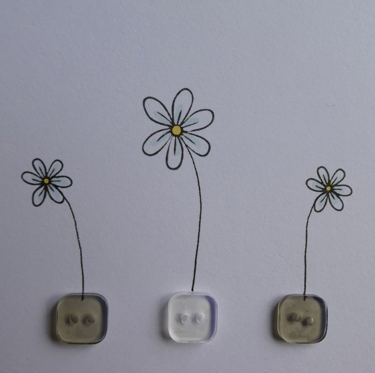 Three different sized daisies have been hand stamped and inked and then finished with hand drawn stems to connect them to a row of 3 button vases, one clear and 2 in a grey/brown shade.