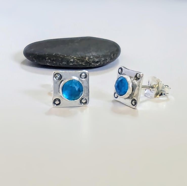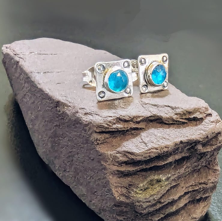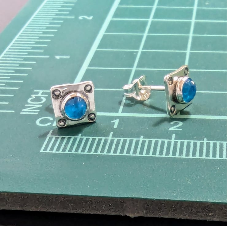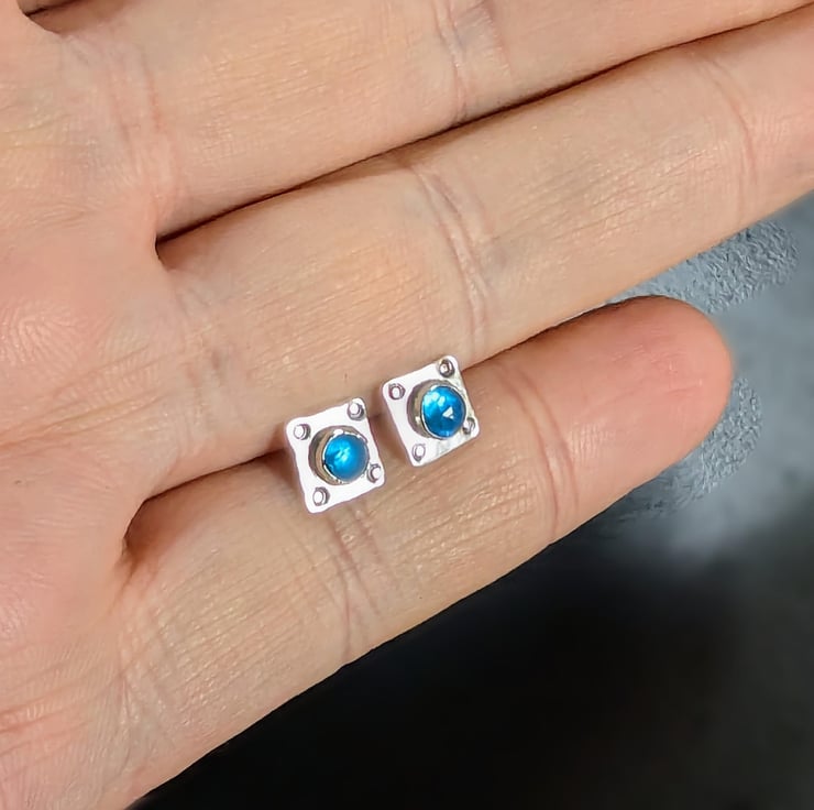 Little 6 mm Square studs with a 4 mm Neon Blue Apatite Rose Cut Gemstones