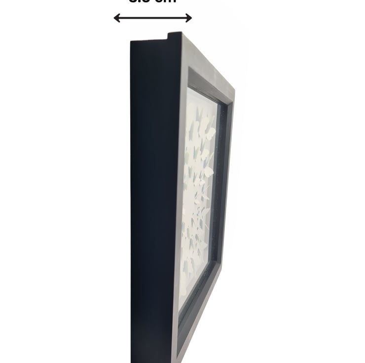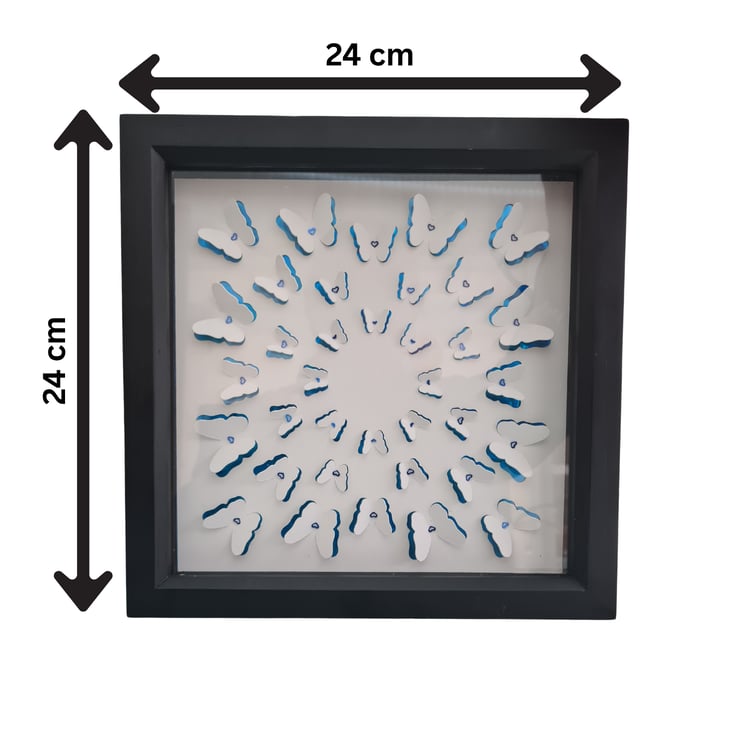 This stunning handmade shadow box features a delicate swarm of white paper butterflies, each with a striking blue heart at its centre, arranged in a gentle spiral formation. The 3D layered design creates beautiful depth and movement, as if the butterflies are fluttering within the frame. Perfect as a statement piece for a bedroom, nursery, or living space, this unique artwork adds a touch of whimsy and elegance to any wall. Handcrafted with care in the UK, the shadow box measures 24 cm x 24 cm x 3.5 cm depth and comes ready to hang in a sleek black wooden frame. A thoughtful gift for butterfly lovers, new homeowners, or anyone who appreciates handmade, nature-inspired decor.