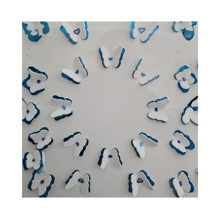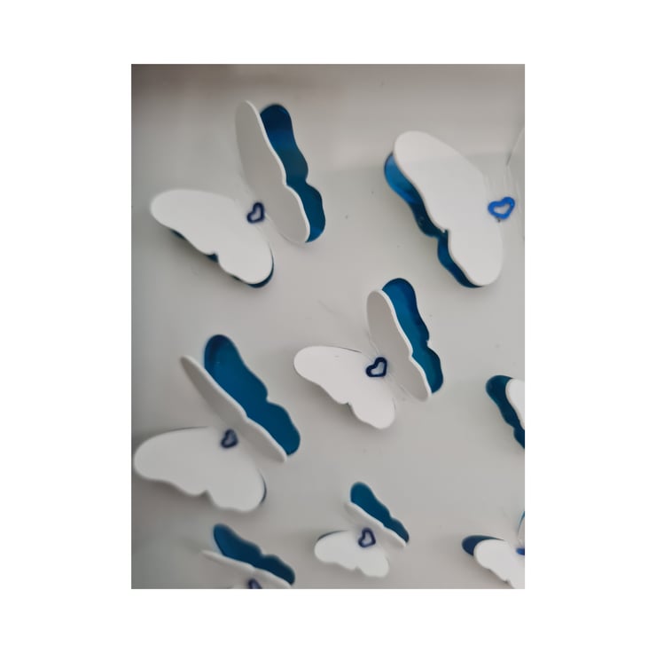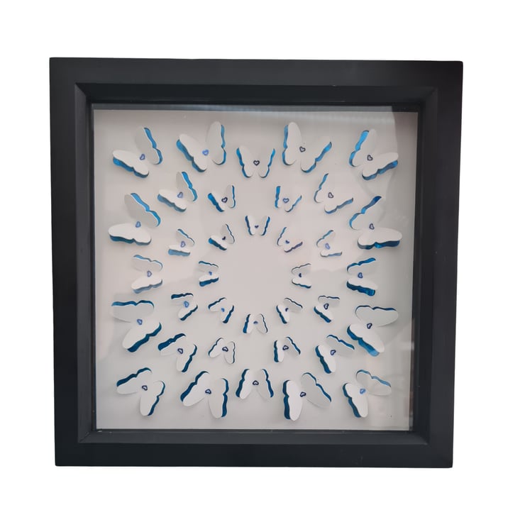 I’ve always been fascinated by the fleeting beauty of butterflies in flight – how something so delicate can appear so full of life and energy. For this piece, I wanted to capture that sense of joyful movement in a static form. The spiral arrangement came from watching butterflies swirl around flowers on a summer’s day, and the blue heart bodies were inspired by vintage love letters—a symbol of affection hidden in plain sight. Each butterfly is hand-cut and positioned to create a sense of depth, turning a simple frame into a little window of wonder.”