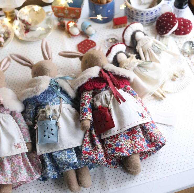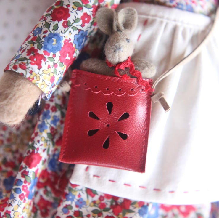 Her accessories include a tiny leather bag, hand punched with a daisy design and containing a baby bunny with a ric rac tie.