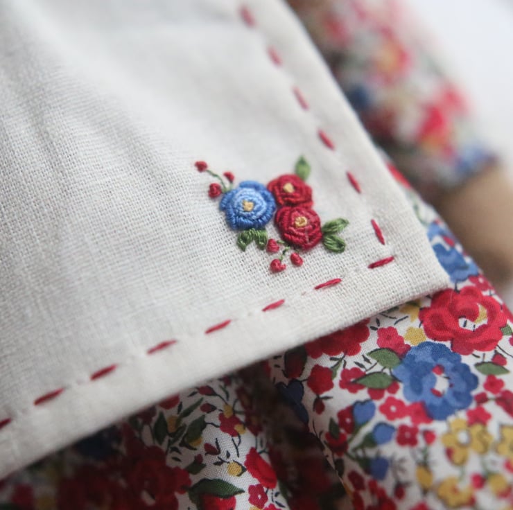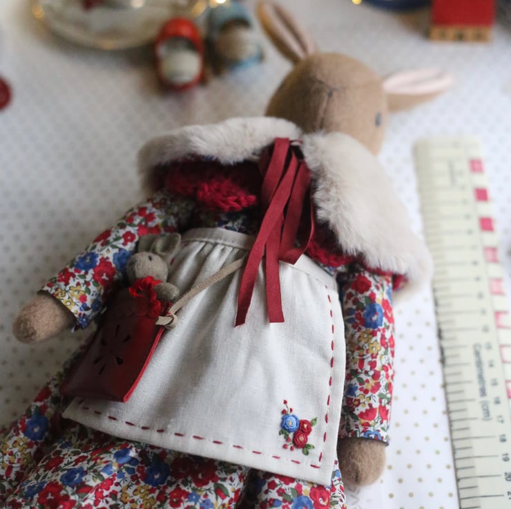Her apron is made from cotton/linen fabric and embroidered with tiny running stitches and a little sprig of flowers.