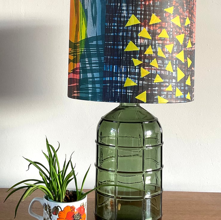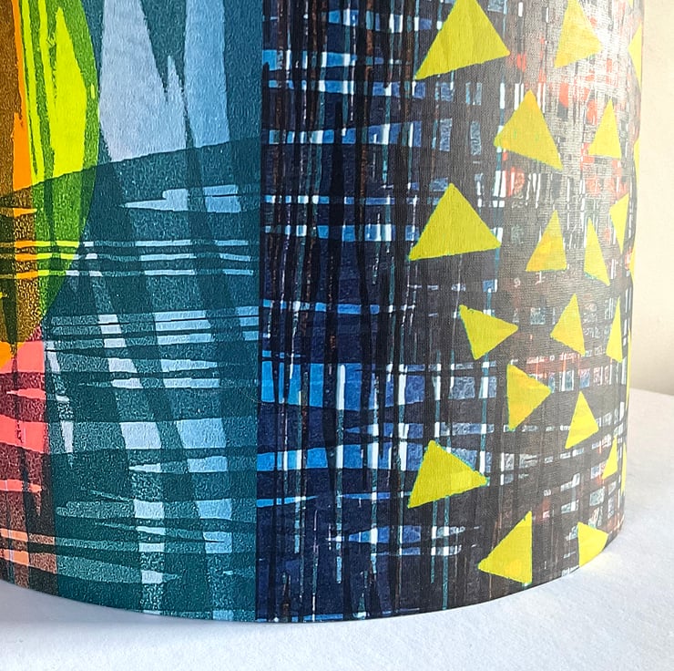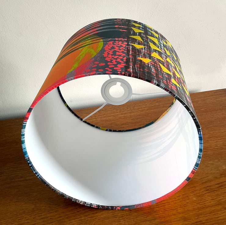 A hand-made lampshade, digitally printed with a yellow sun abstract design.