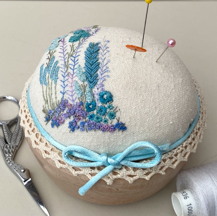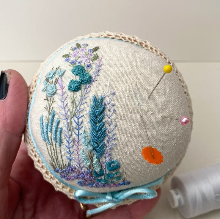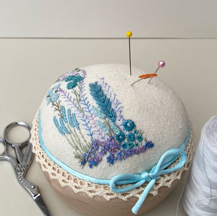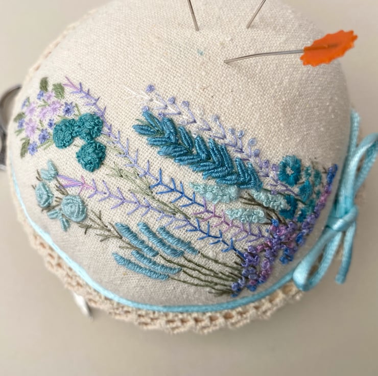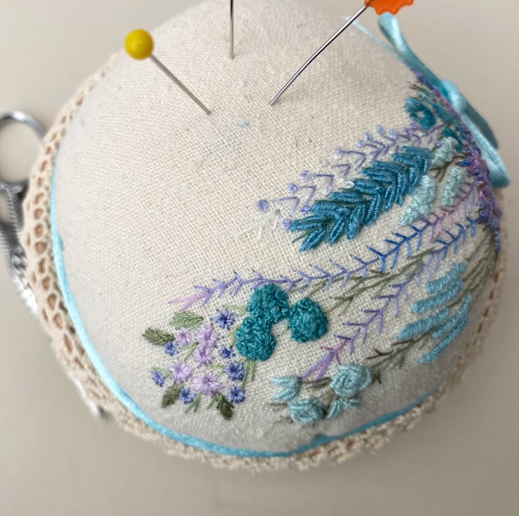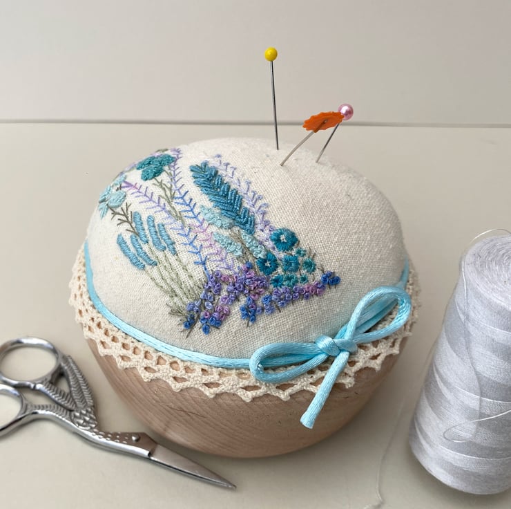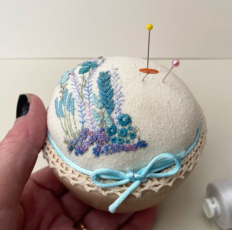 A unique hand embroidered pin cushion created and designed by Bearlescent