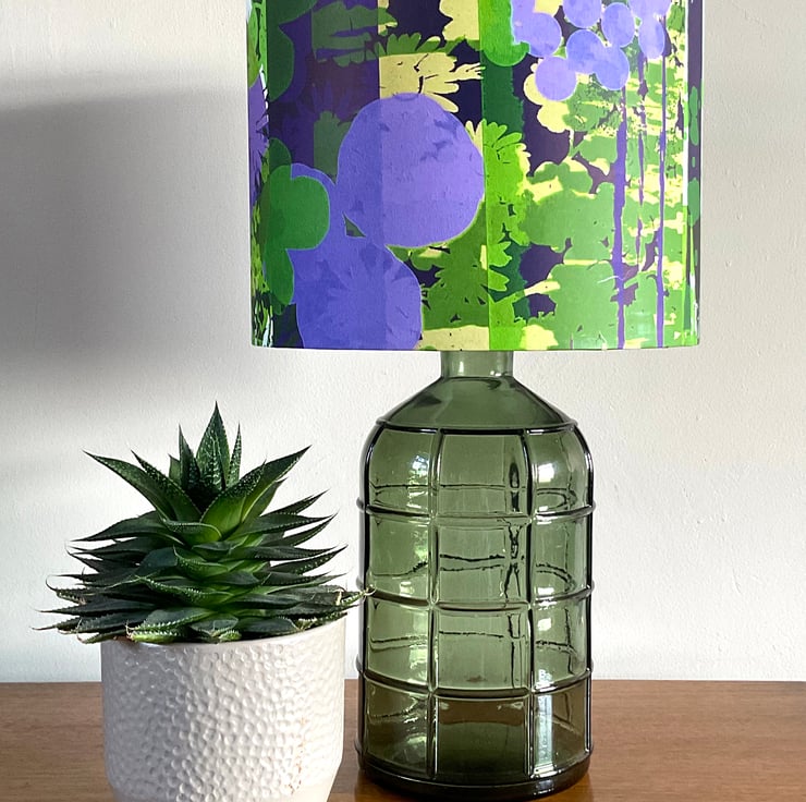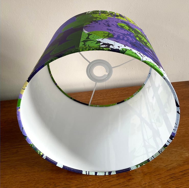 A hand-made lampshade, digitally printed with a purple circles abstract design. This design is different from each angle.