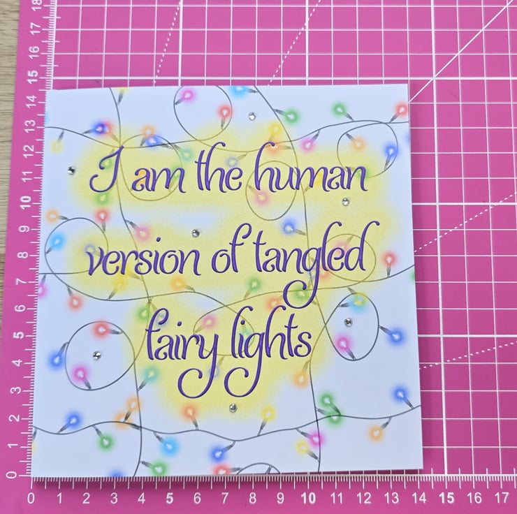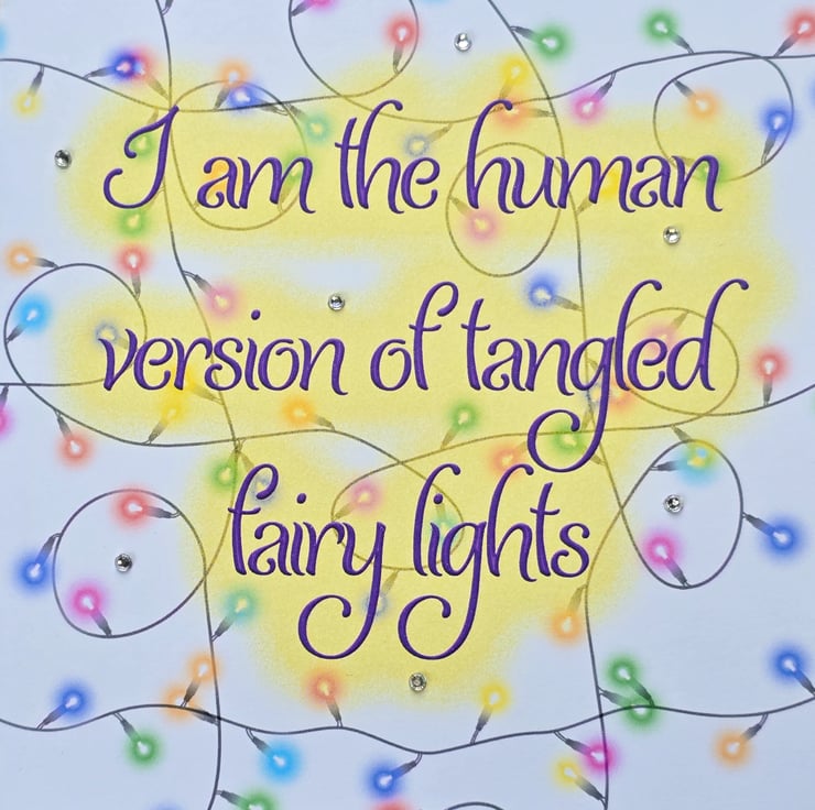 I designed this card to be a fun, honest acknowledgment of the season's chaos. The illustration is deliberately bright and chaotic, and I added diamante sparkles because, even when we're utterly tangled, we still manage to shine.