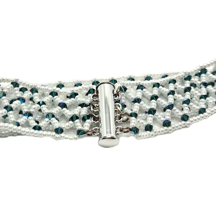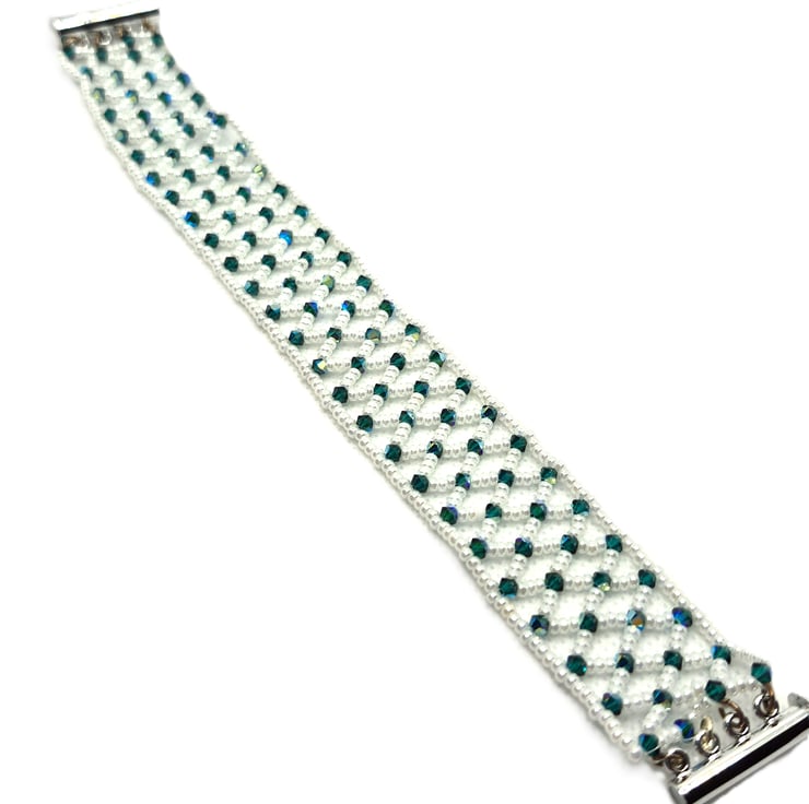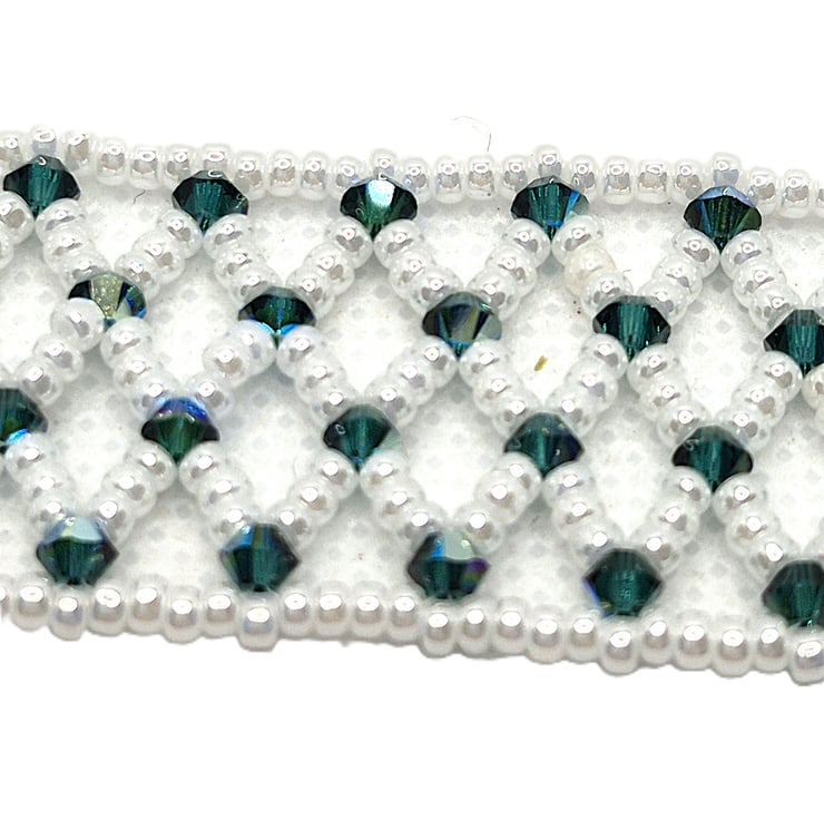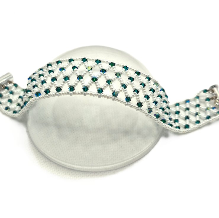 A cuff style bracelet made with white seed beads in a net with green Swarovski crystal bicones