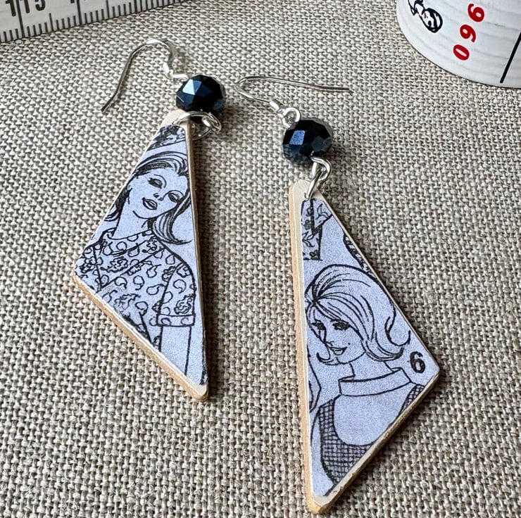 Lovely old graphics from mid century dresspatterns are decoupaged onto recycled wood and sealed with a layer of varnish to create a striking pair of earrings for the keen dressmaker. Jump rings etc are silver plated and ear wires are sterling silver. The earrings are finished with a faceted glass bead which catches the light nicely. Presented wrapped in recycled tissue paper in a purpose made recycled card pillow box.