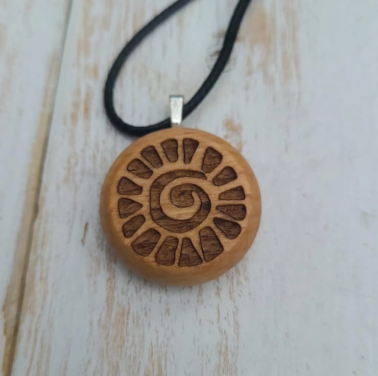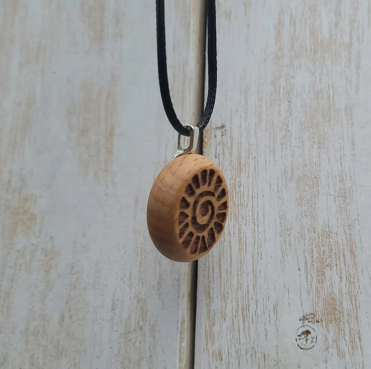 Handmade from untreated beechwood (25mm wide, 8mm thick), the design combines a spiral of life at the centre with radiating sun rays.