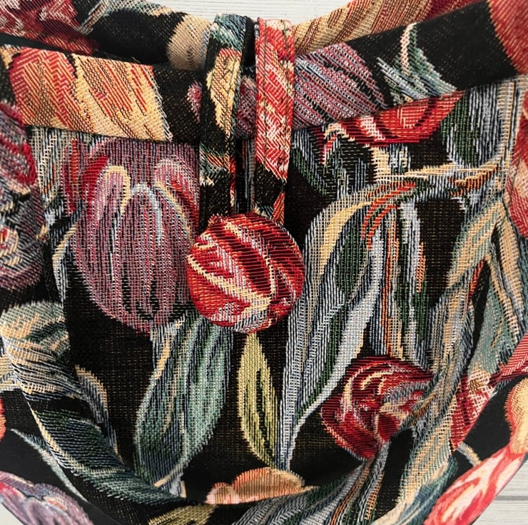 Add a splash of color and character to your everyday look with this beaiutiful tulip bucket bag. Crafted from a high-quality tapestry fabric,