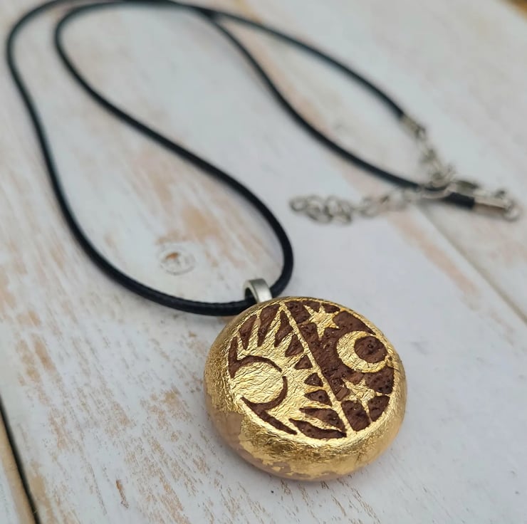 Handmade from natural beechwood, this round pendant is gilded on the front only with genuine 22k gold leaf, creating a beautiful contrast with the natural wood base. The design features a laser-engraved sun and moon symbol, representing harmony, balance, and spiritual connection.