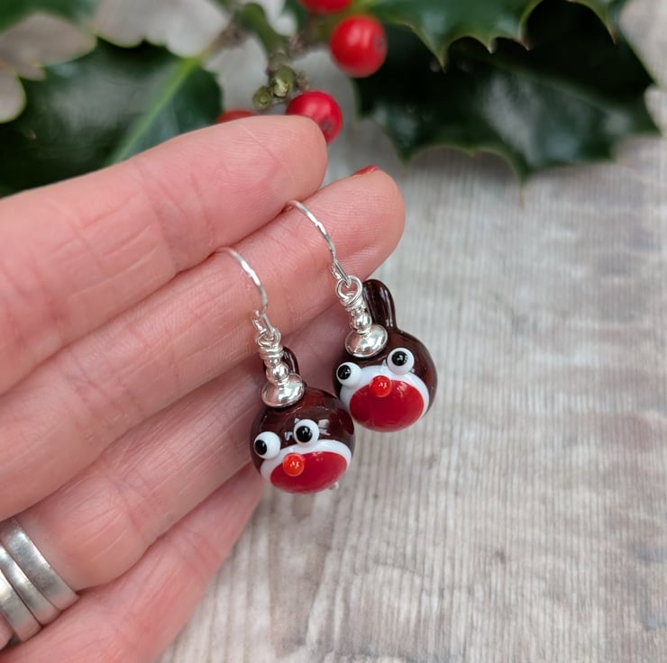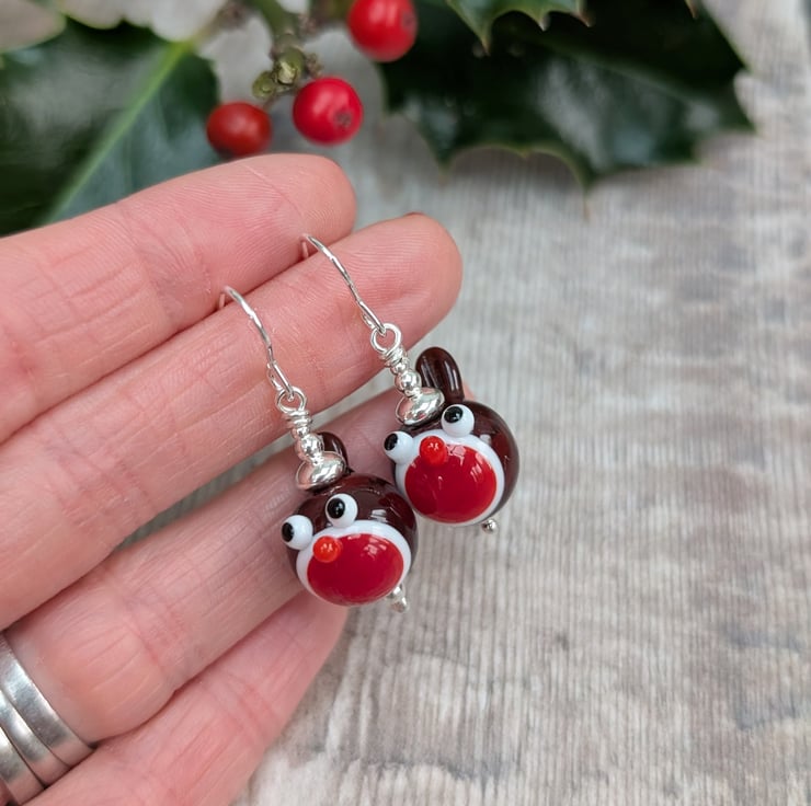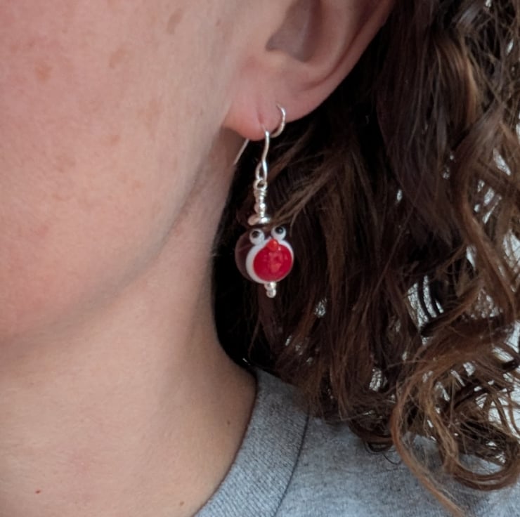 SILVER CHRISTMAS ROBIN LAMPWORK GLASS EARRINGS