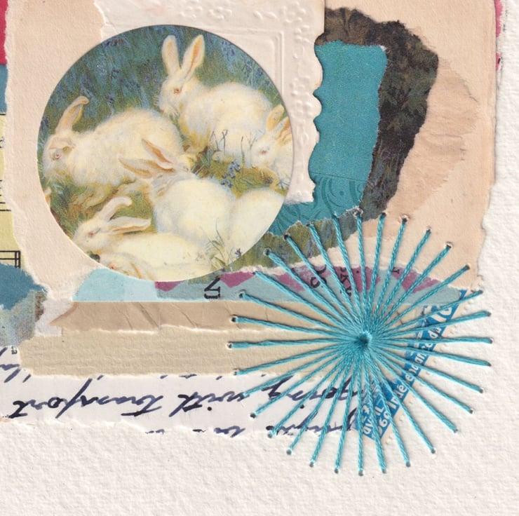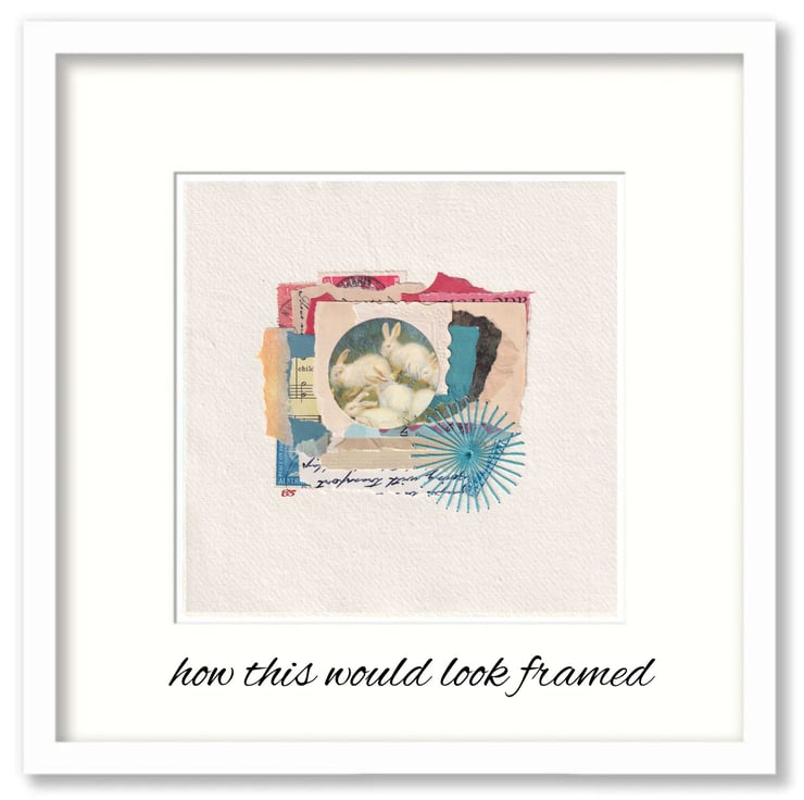 Adorable little white rabbits enjoying the spring grass. A charming hand-made collage approx. 8 x 8 inches, on deckle edged handmade paper, using vintage paper, postcards and ephemera, with hand embroidery (UNFRAMED)